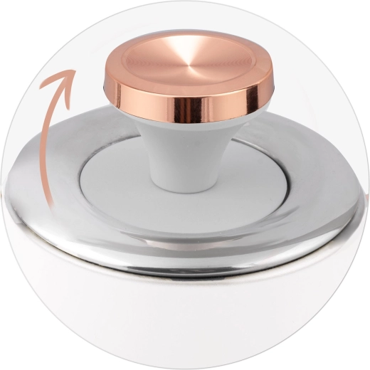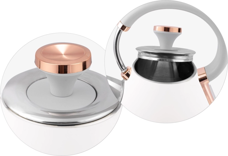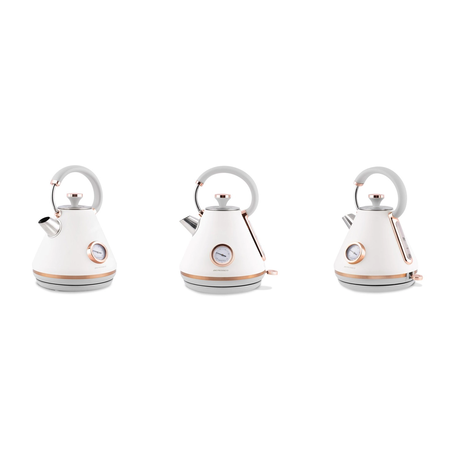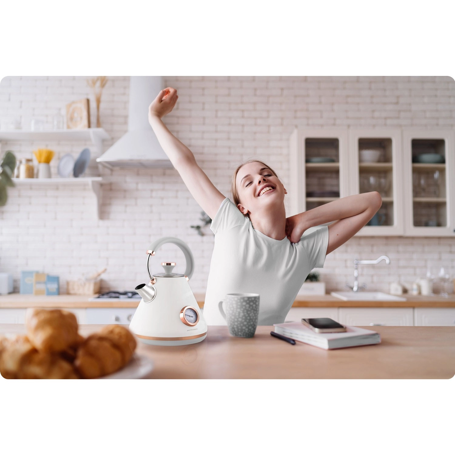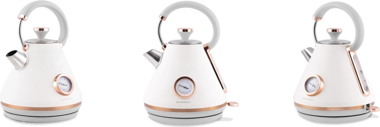 - Design: nadčasový retro styl v odstínu zlomené bílé s růžově zlatými akcenty – elegantní doplněk do kuchyně.