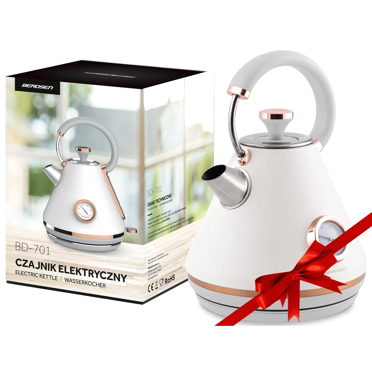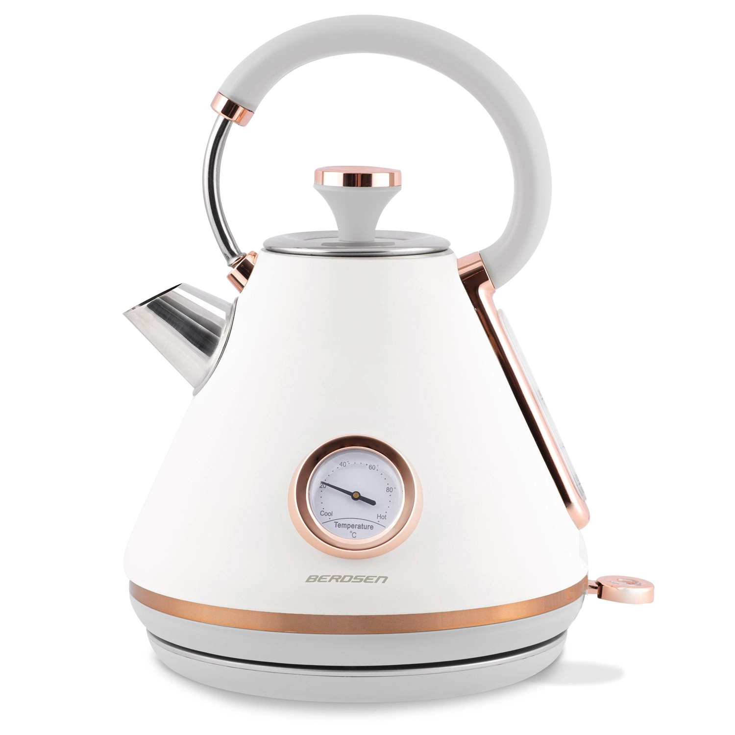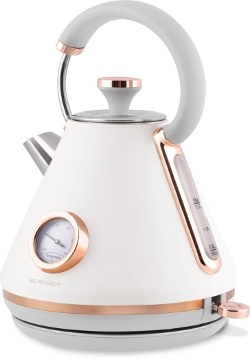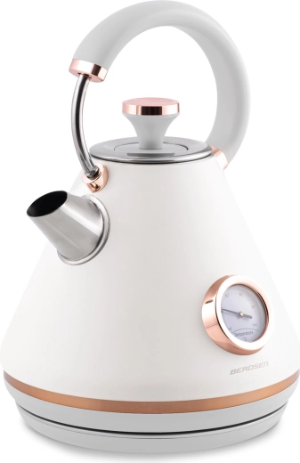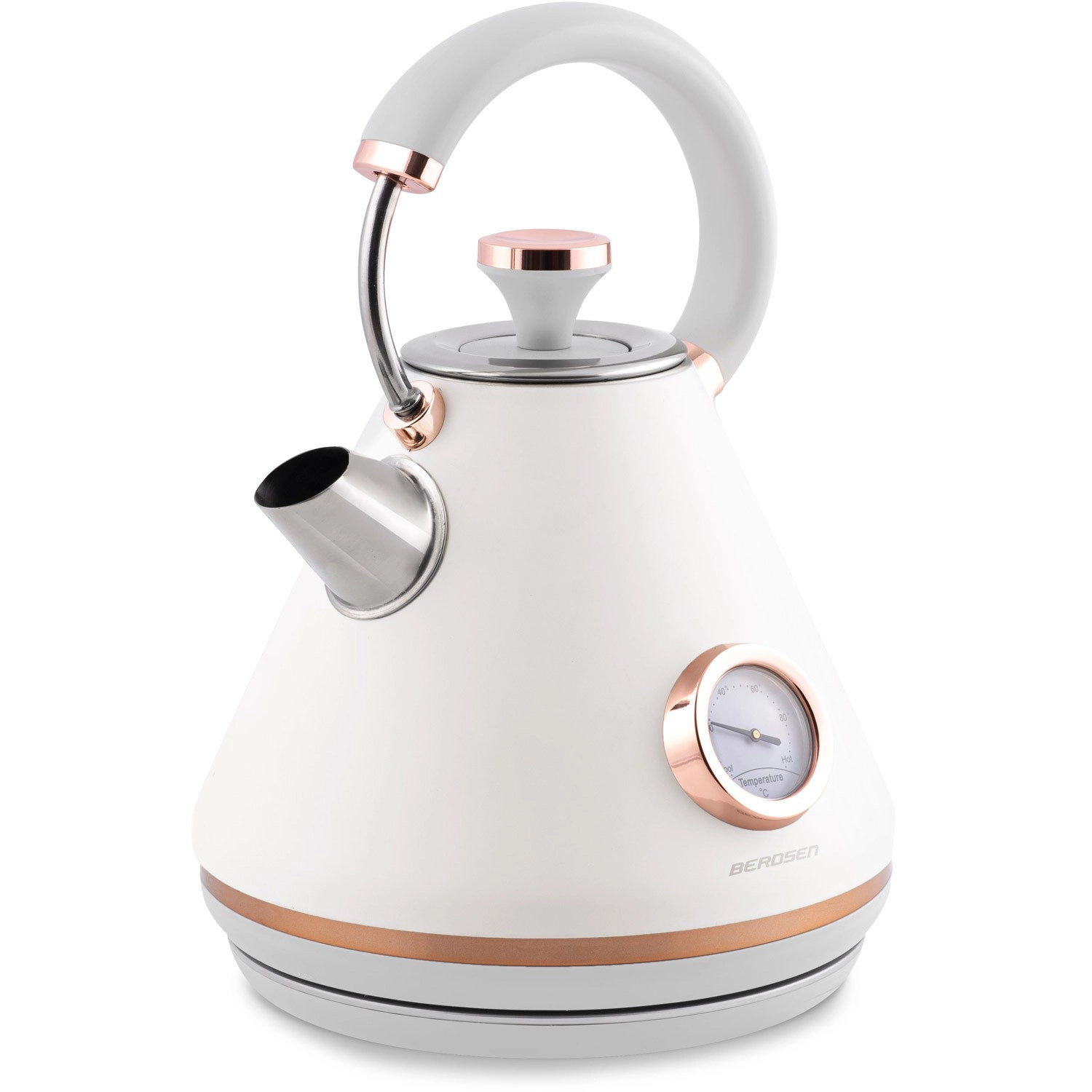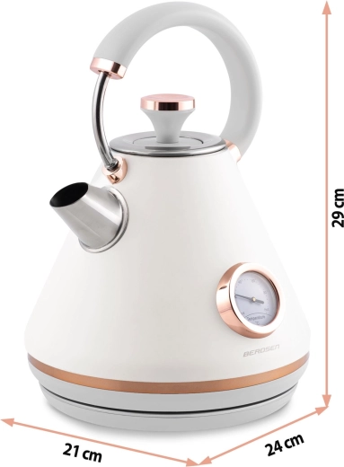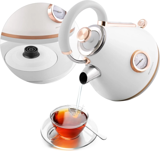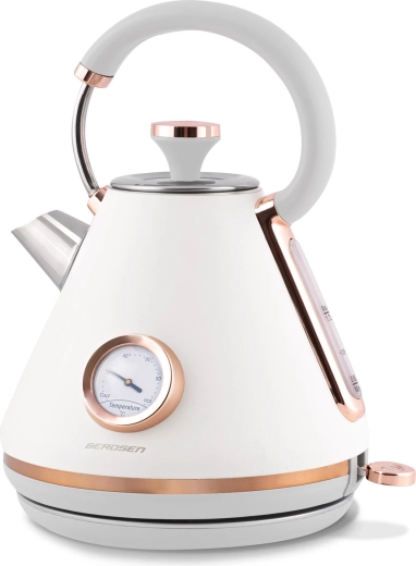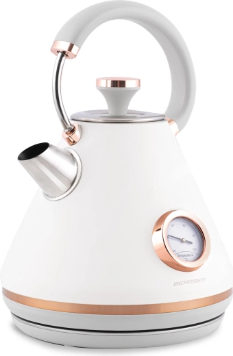 Stylová elektrická konvice BERDSEN v retro designu s objemem 1,7 l přináší rychlý ohřev vody a přesné sledování teploty díky integrovanému teploměru. Nabízí kovové tělo s matným povrchem, 360° otočnou základnu, podsvícený spínač, vyjímatelný kovový filtr proti vodnímu kameni a ergonomické, neohřívající se madlo pro bezpečné a pohodlné nalévání.