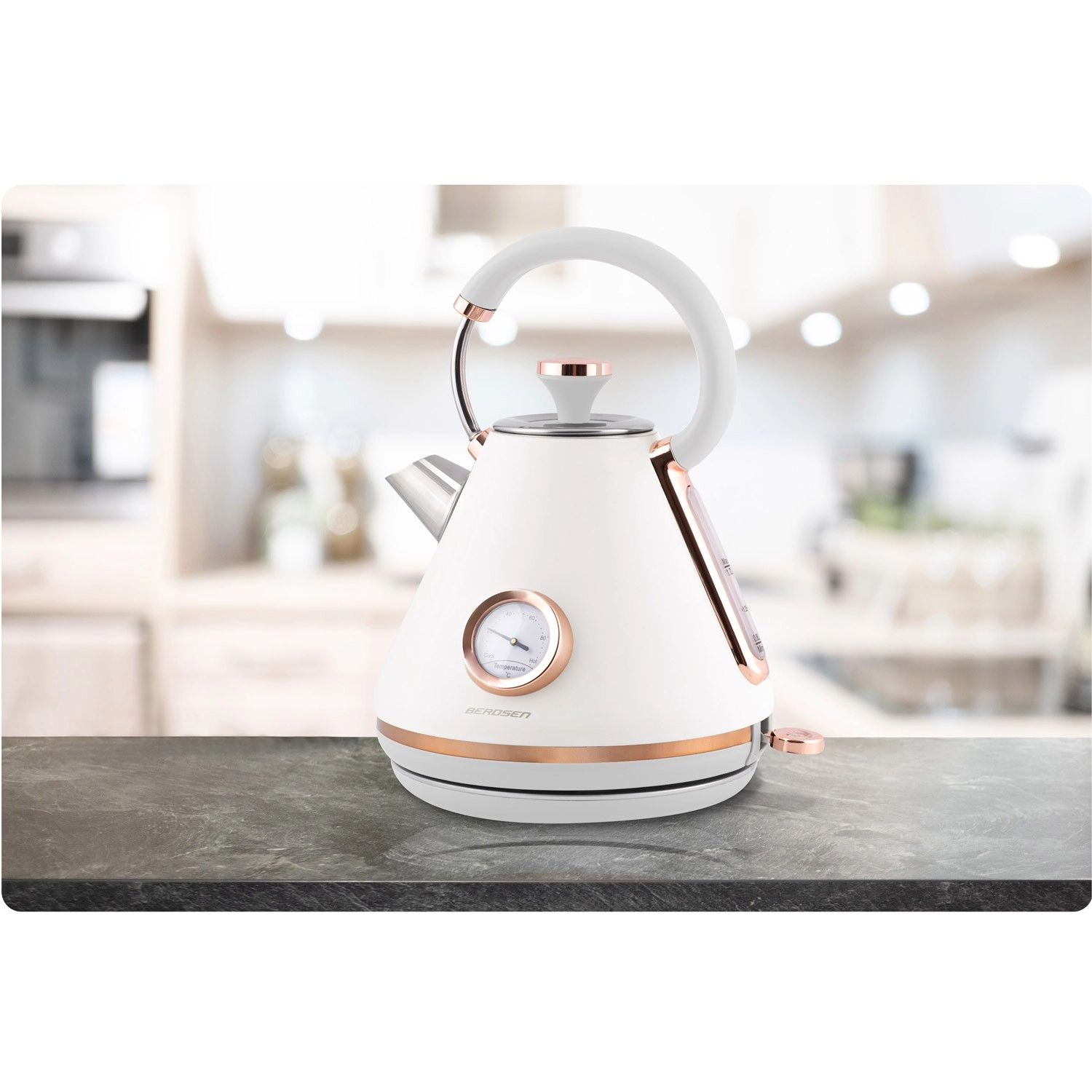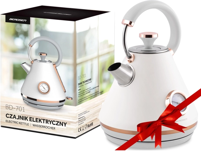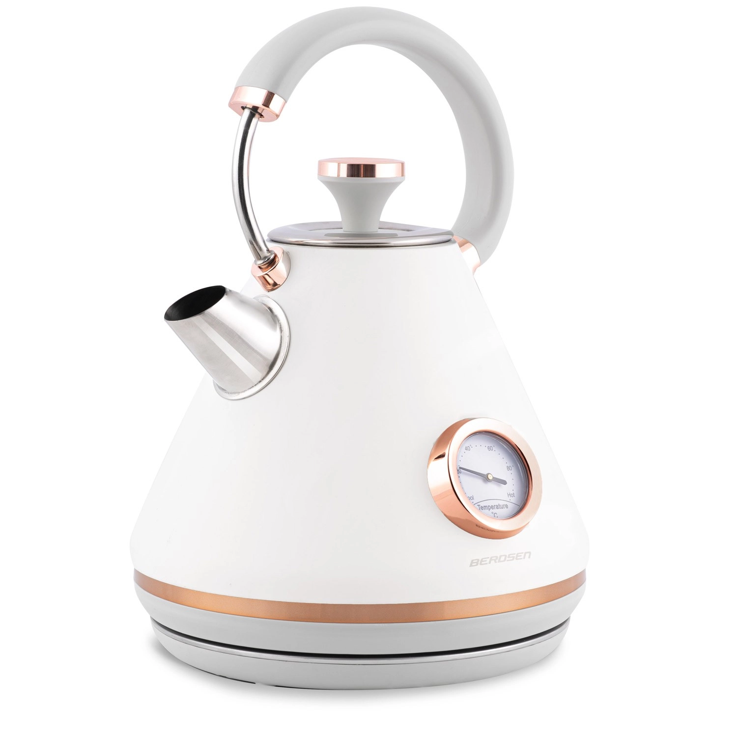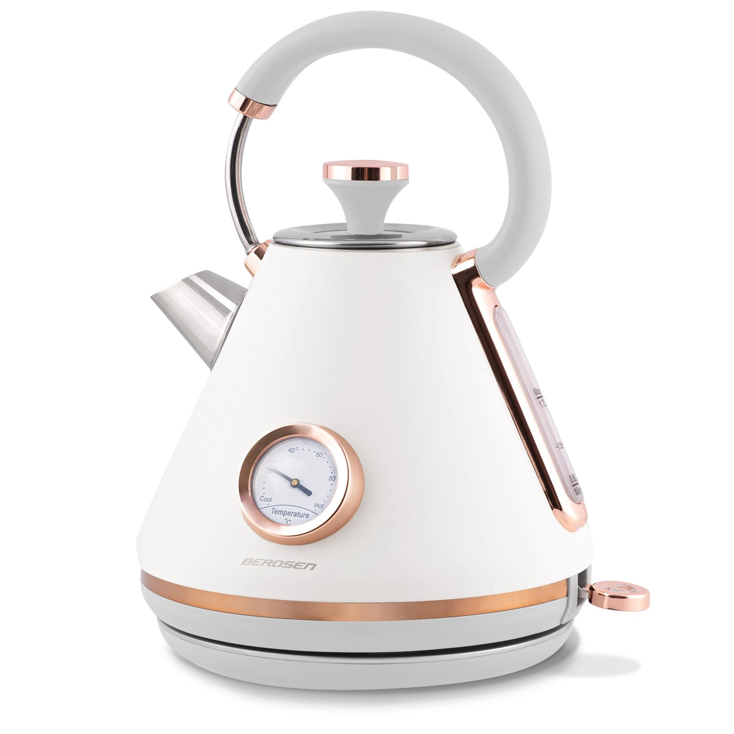 Stylová elektrická konvice BERDSEN v retro designu s objemem 1,7 l přináší rychlý ohřev vody a přesné sledování teploty díky integrovanému teploměru. Nabízí kovové tělo s matným povrchem, 360° otočnou základnu, podsvícený spínač, vyjímatelný kovový filtr proti vodnímu kameni a ergonomické, neohřívající se madlo pro bezpečné a pohodlné nalévání.
