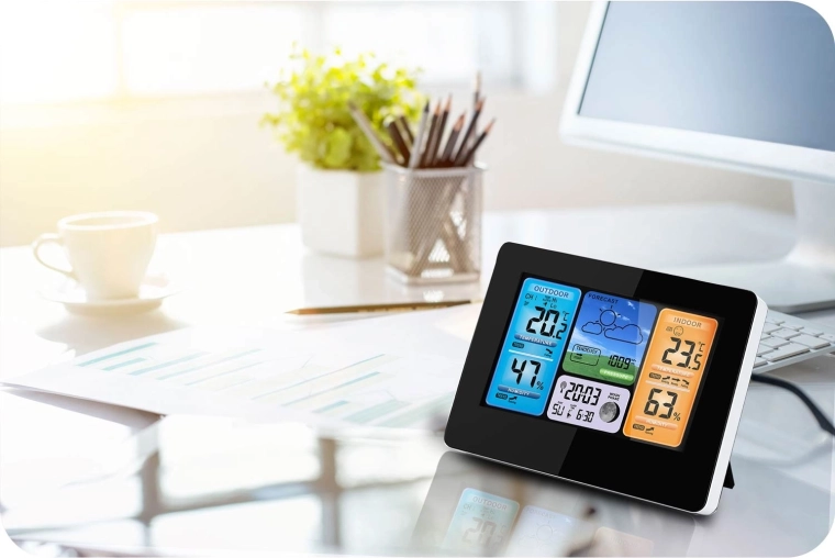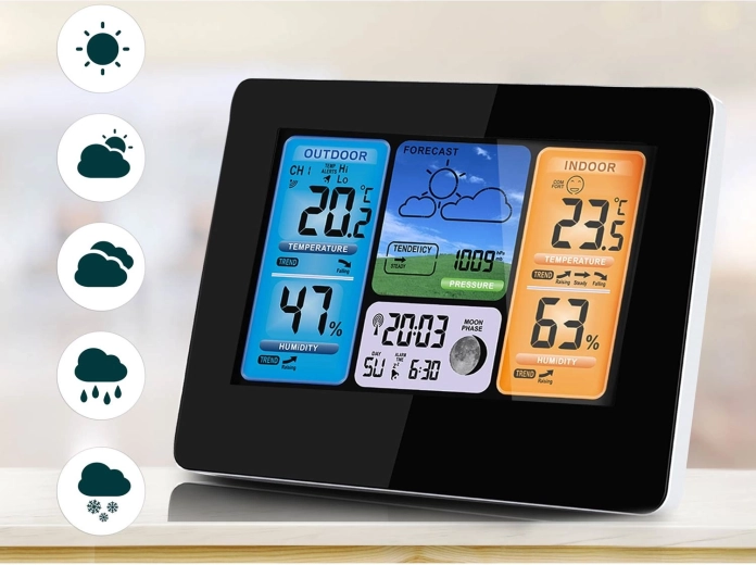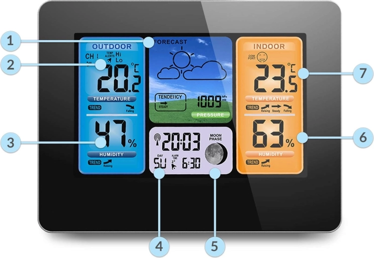 Udržujte ideální klima doma i venku díky integrovanému hygrometru a přehlednému multibarevnému LCD. Stanice průběžně vyhodnocuje teplotu, vlhkost a tlak, aby poskytla rychlou a srozumitelnou předpověď počasí na následujících 12 hodin včetně ikon trendů. Praktické funkce jako úroveň komfortu, fáze Měsíce, 12/24h čas, kalendář do roku 2099 a budík se snooze z ní dělají všestranného pomocníka pro každý den.