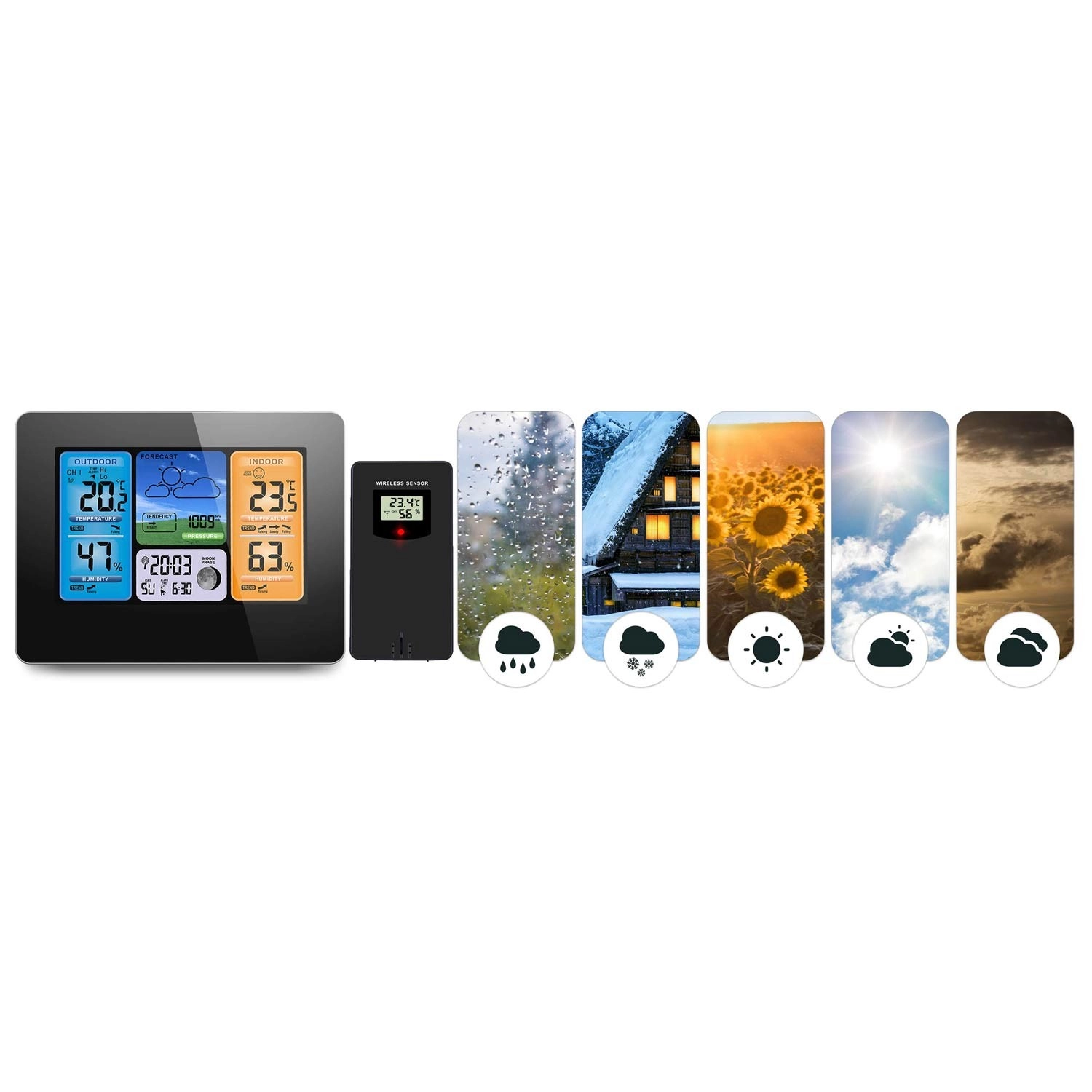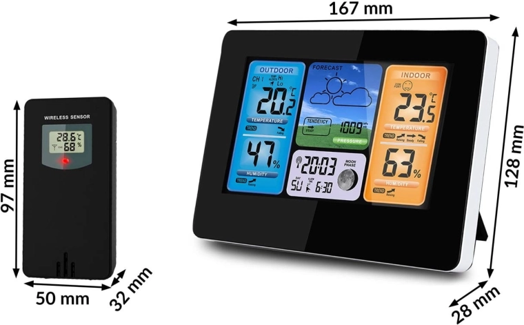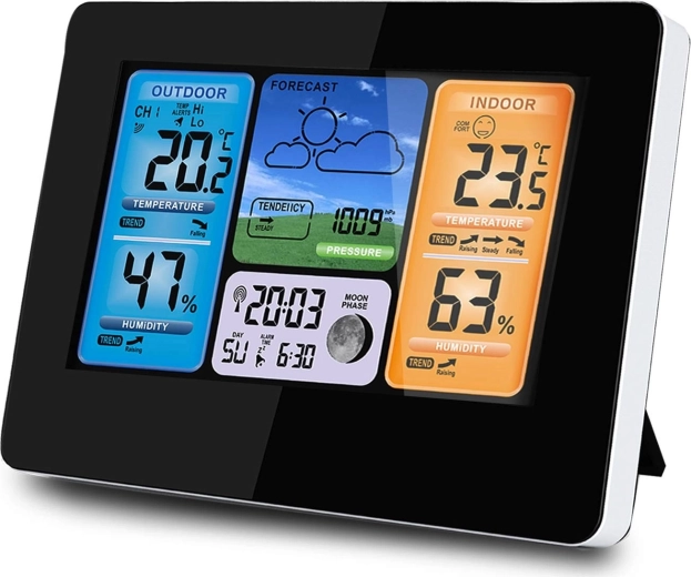 Moderní bezdrátová meteostanice s barevným LCD poskytuje přesnou předpověď na 12 hodin, sleduje vnitřní a venkovní teplotu a vlhkost, zobrazuje barometrický tlak, fáze Měsíce, čas a kalendář. Nabízí alarm mrazu/vedra, budík s funkcí snooze a čtyřúrovňové podsvícení pro snadné čtení hodnot. Bezdrátový senzor s dosahem až 60 m a možnost připojení dalších čidel zajistí spolehlivé měření pro váš domov i zahradu.