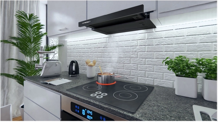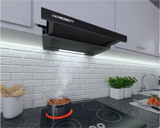 Tato teleskopická (zásuvná) digestoř je ideální volbou pro moderní i minimalistické kuchyně, kde se počítá každý centimetr. Diskrétně se ukryje do skříňky a po vysunutí předního panelu zvětší plochu sání, takže účinněji zachytí páry a pachy přímo nad varnou plochou. Úsporné LED osvětlení zlepší přehled nad hrnci a pánvemi, a zároveň šetří energii.