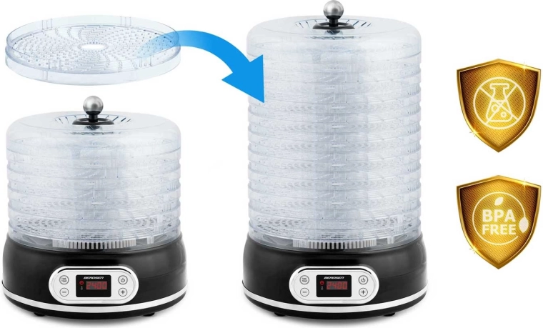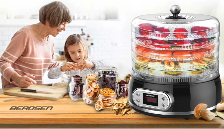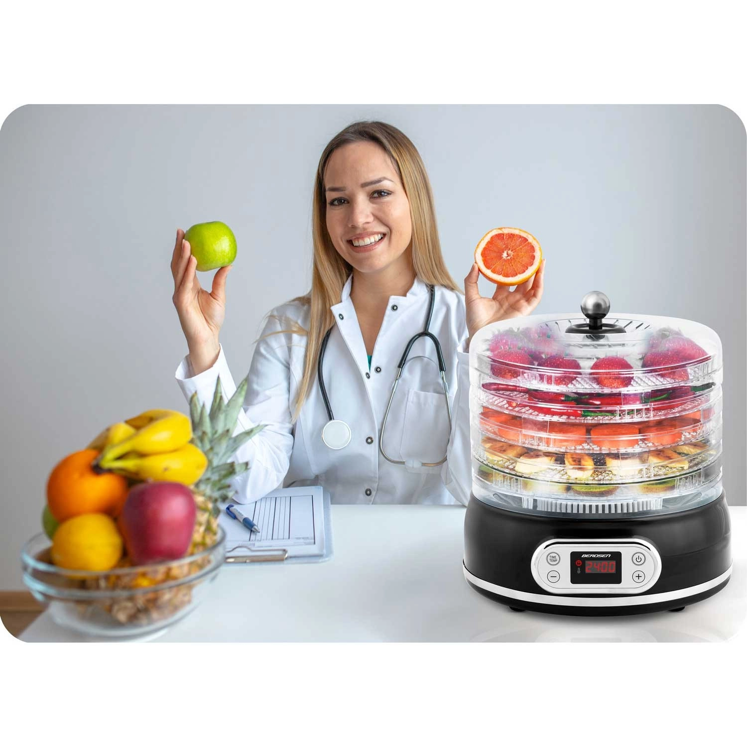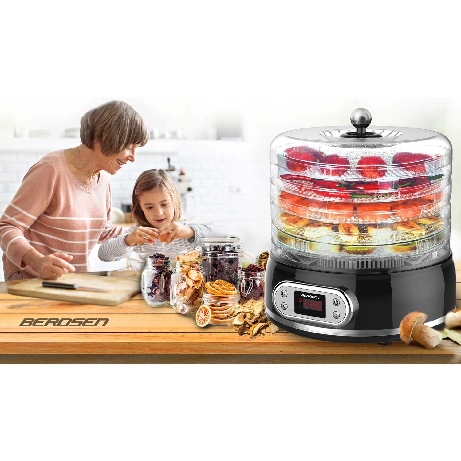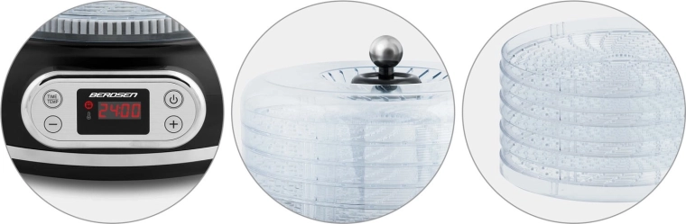 Vytvářejte zdravé a chutné pochoutky – od křupavých jablečných kroužků přes sušené bylinky až po domácí jerky. Sušička Berdsen s elektronickým ovládáním a čitelným displejem zaručí precizní nastavení času i teploty. Termooběh zajišťuje rovnoměrné proudění teplého vzduchu, takže plátky sušíte efektivně bez přepékání.