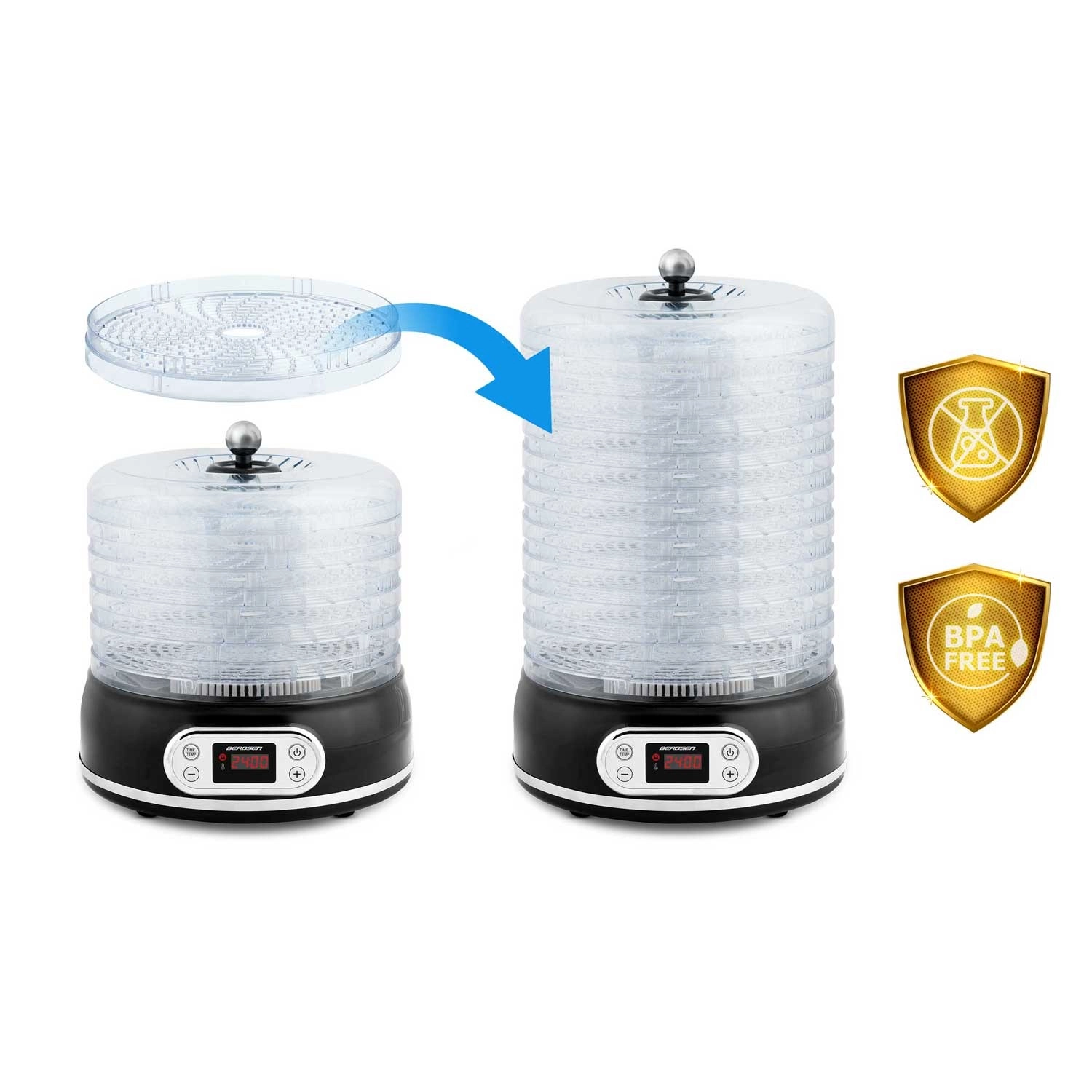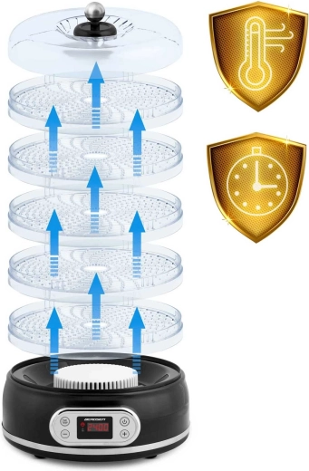 Integrovaný ventilátor cirkuluje teplý vzduch po všech patrech, takže ovoce, zelenina i bylinky schnou stejnoměrně bez nutnosti častého překládání.