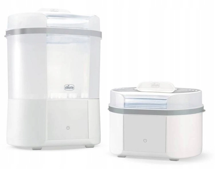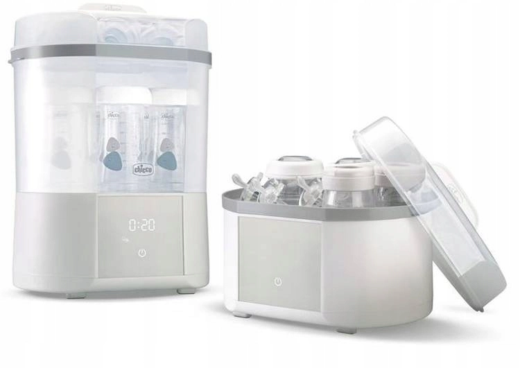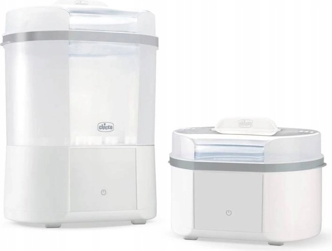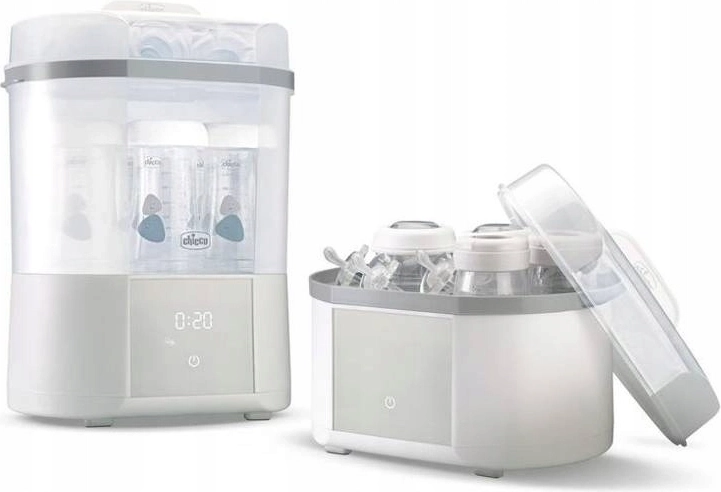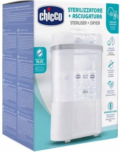 Moderní elektrický parní sterilizátor CHICCO se postará o rychlou a přirozenou sterilizaci za 5 minut a díky integrované funkci sušení odstraní kapky i zbytky vlhkosti. Pojme až 6 lahví a příslušenství, nabízí programy FULL a COMPACT, odložený start a pokročilý filtr pro bezpečný provoz bez prachových částic. Ideální volba pro hygienicky čisté lahve, dudlíky a další potřeby.