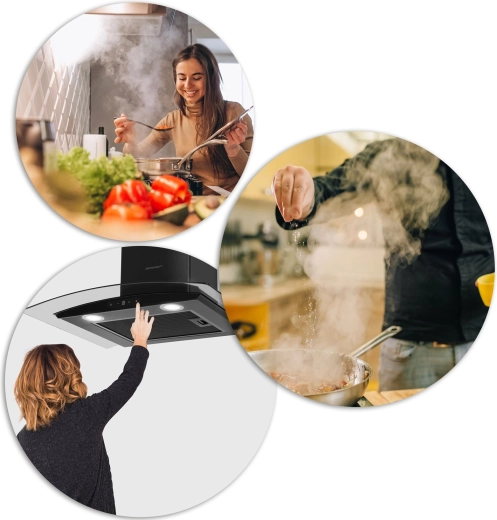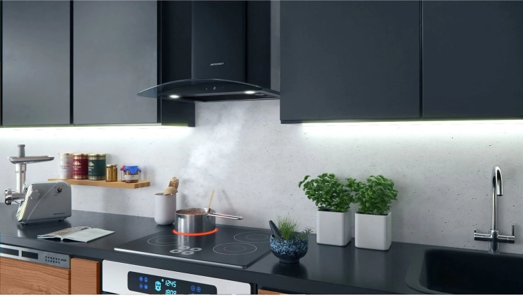 Profilované tvrzené sklo a černá nerez odolají skvrnám i vysokým teplotám. 5vrstvý hliníkový filtr snadno vyjmete a vyčistíte.