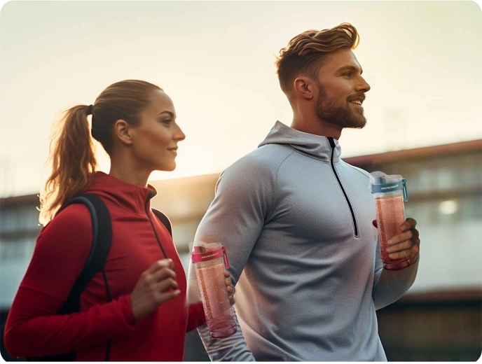 Dvě přenosné lahve 0,57 l s nekapajícím víčkem a barevnými uzávěry. Namixujete přímo v lahvi a můžete vyrazit.
