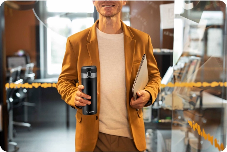 Dvoustěnná nerezová ocel odolá nárazům a skvěle izoluje. Kompaktní tvar přesně padne do většiny držáků nápojů v automobilu.