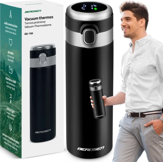 Stylová a praktická termoska s kapacitou 450 ml je navržena pro každodenní použití. Dvoustěnné vakuové stěny z nerezové oceli spolehlivě uchovají teplotu nápoje po celý den. Dotykový LED teploměr ve víčku vám jedním dotykem okamžitě ukáže aktuální teplotu. Ergonomický tvar skvěle padne do ruky i do držáku v autě.