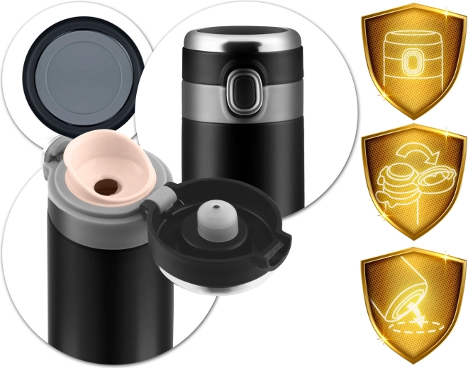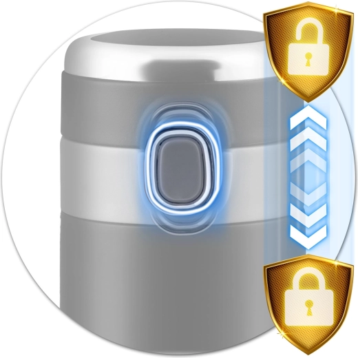 Bezpečné a pohodlné používání zajišťuje víčko na tlačítko click‑clack s pojistkou proti otevření. Spodní amortizační kroužek tlumí nárazy při odkládání a prodlužuje životnost. Díky nízké hmotnosti si termosku vezmete kamkoli – na turistiku, do práce i do školy.