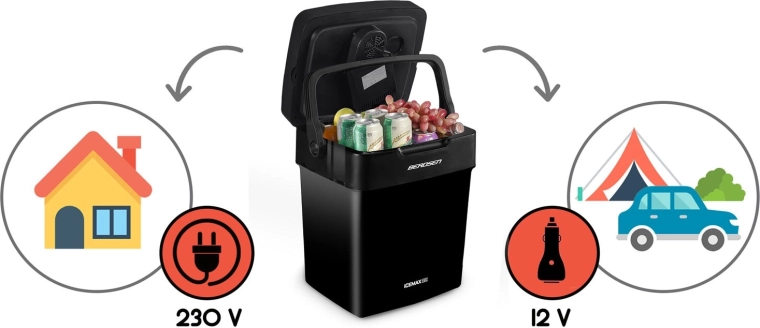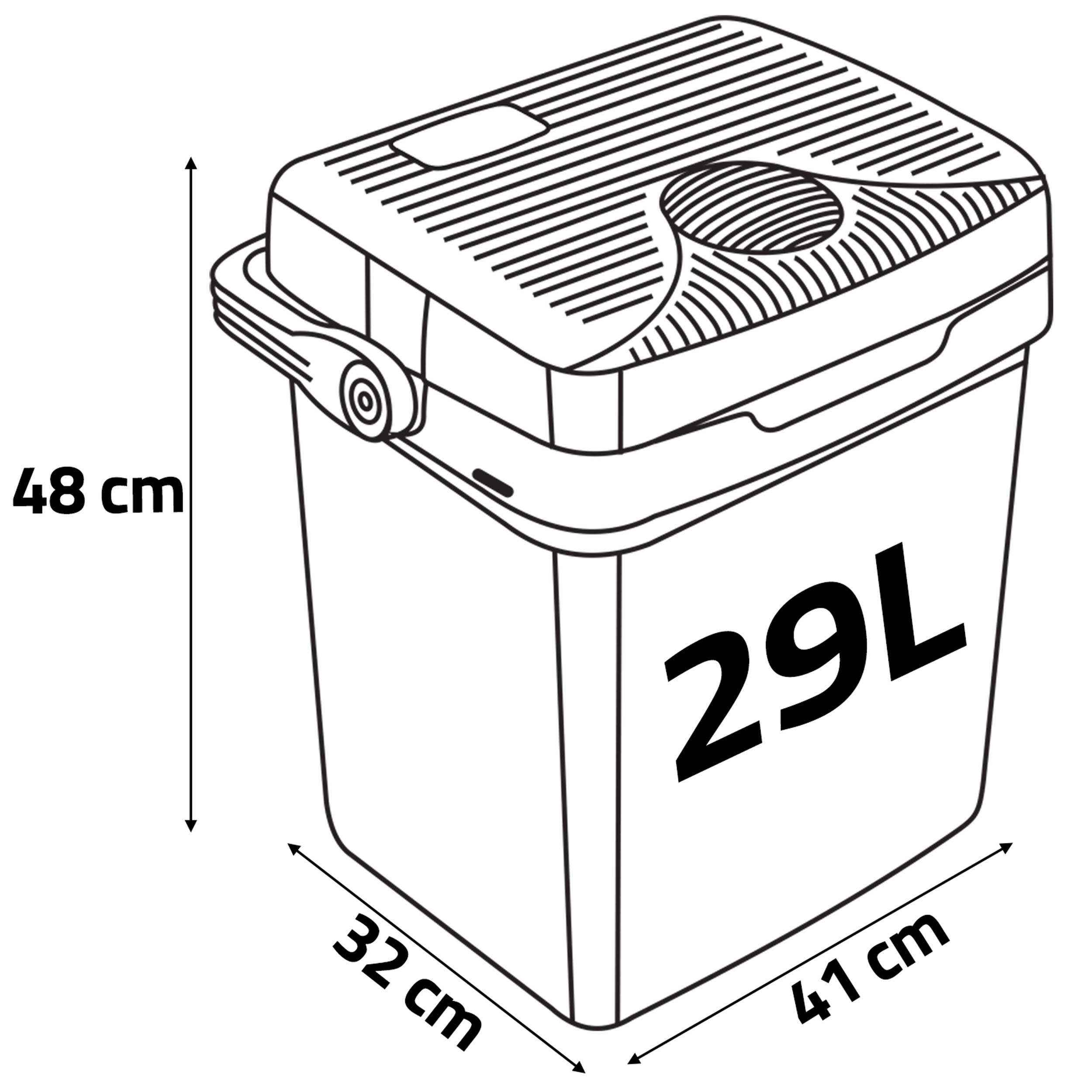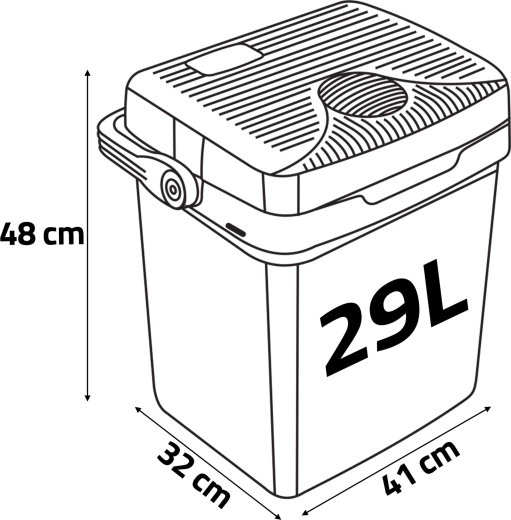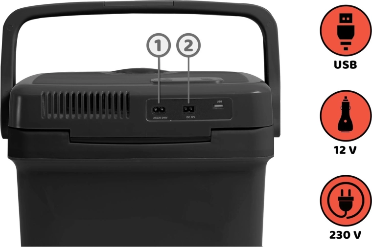 Ovládání je jednoduché přes elektronický panel s možností nastavení teploty. Napájení 12 V v autě i 230 V v domácnosti poskytuje flexibilitu, USB port poslouží pro nabíjení telefonu na cestách. Podvojná izolace, těsnění víka a vestavěný ventilátor udržují stabilní klima uvnitř. Sklopné madlo zároveň funguje jako pojistka víka a odnímatelná dělicí mřížka usnadní přehledné uložení potravin a nápojů.