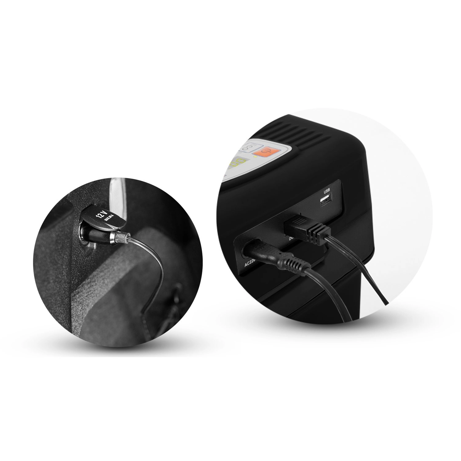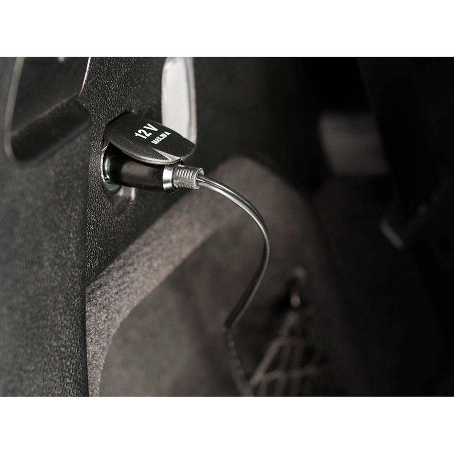 Zapojte v autě přes 12 V zásuvku nebo doma do 230 V. Integrovaný USB port umožní dobíjet telefon či navigaci během jízdy.