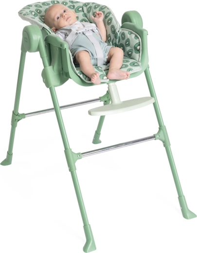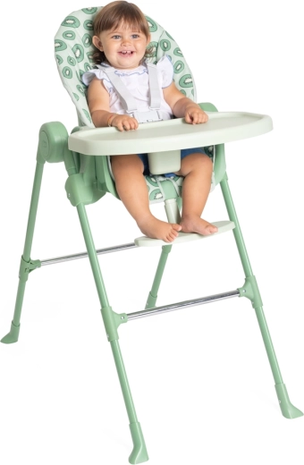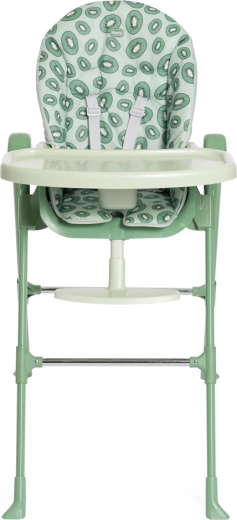 Bezpečné sezení zajišťují 5bodové popruhy a stabilní, široce rozkročené nohy s výztuhami. Odnímatelný jídelní tác poskytuje praktický prostor pro krmení i aktivity a potah se snadno čistí. Nadčasový design a svěží kiwi odstín skvěle zapadnou do každého interiéru.