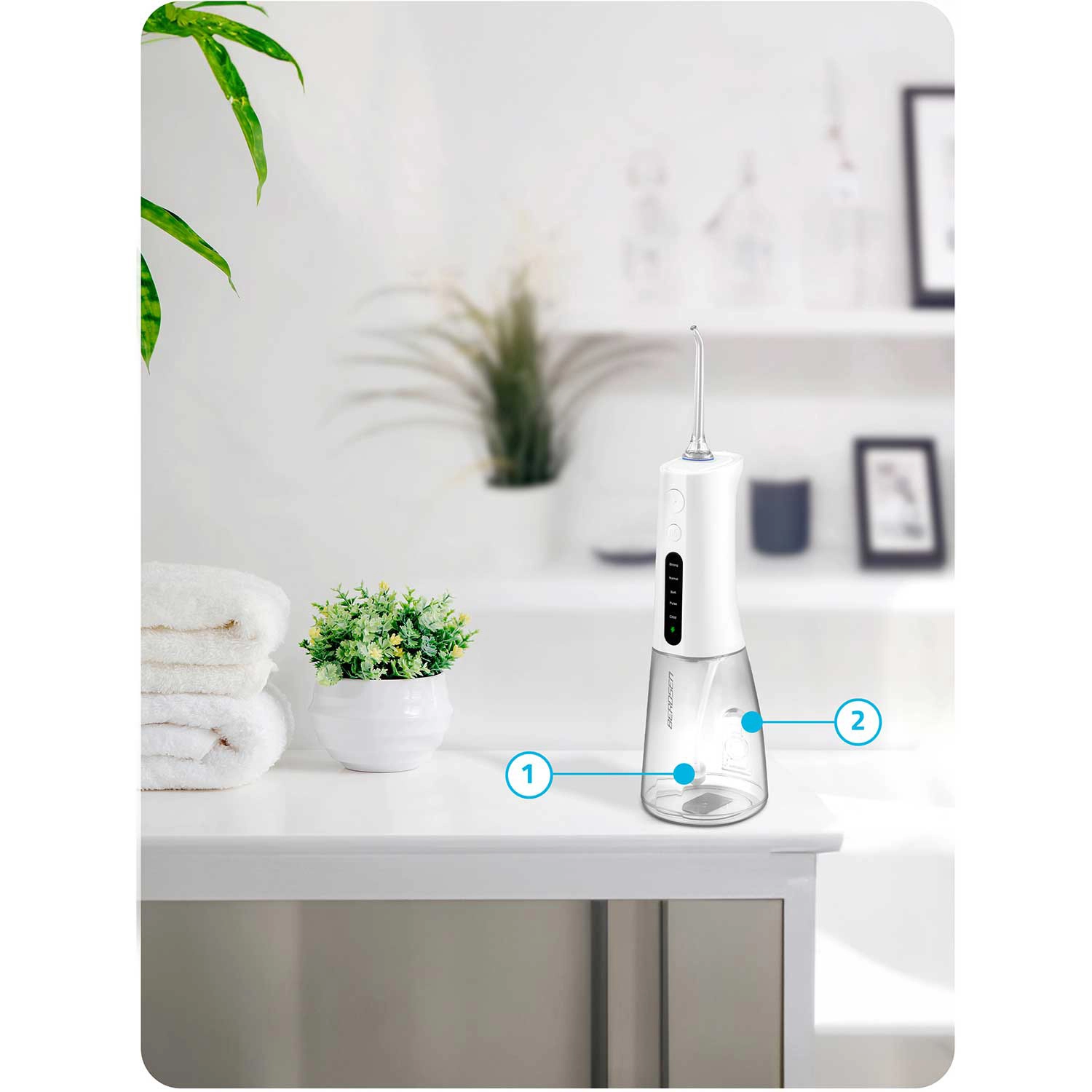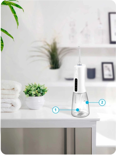 Vyberte si ze 5 režimů – Strong, Normal, Soft, Child a Pulse – a přizpůsobte tlak vody svým potřebám. Velká nádržka 300 ml vystačí na kompletní irigaci bez přerušování, zatímco otočná tryska 360° usnadní přístup ke všem plochám zubů a podél linie dásní. Tichý chod ≤72 dB, časovač 2 minuty a voděodolná konstrukce IPX7 dělají z tohoto irigátoru spolehlivého parťáka doma i na cestách.