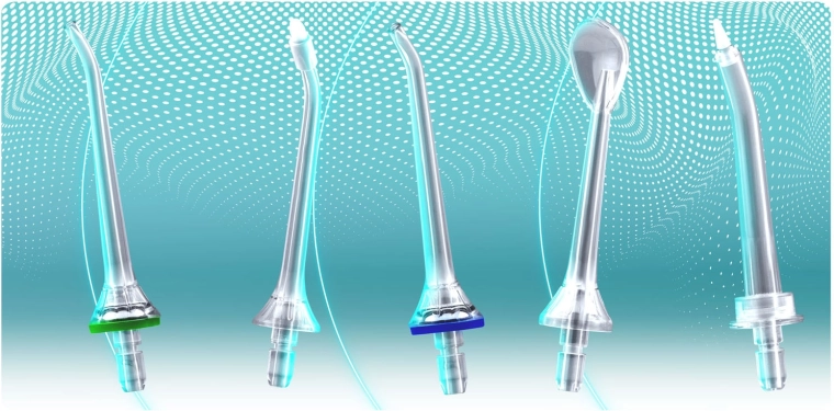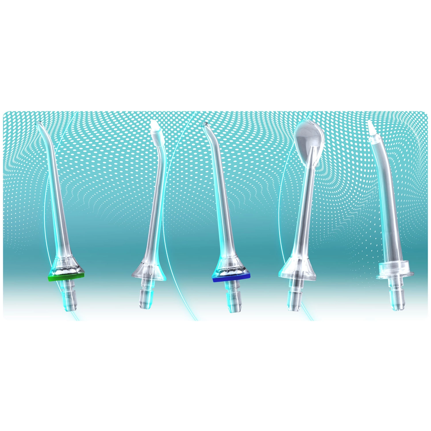 V balení najdete 5 specializovaných trysek (2 standardní, na jazyk, ortodontickou a pro parodontální choboty), USB‑C kabel a praktické pouzdro. Vestavěná baterie vydrží na jedno nabití až 3–4 týdny, takže máte čistý úsměv vždy po ruce.