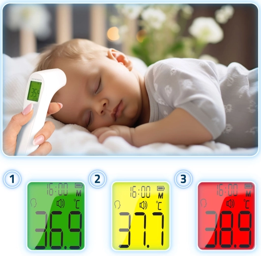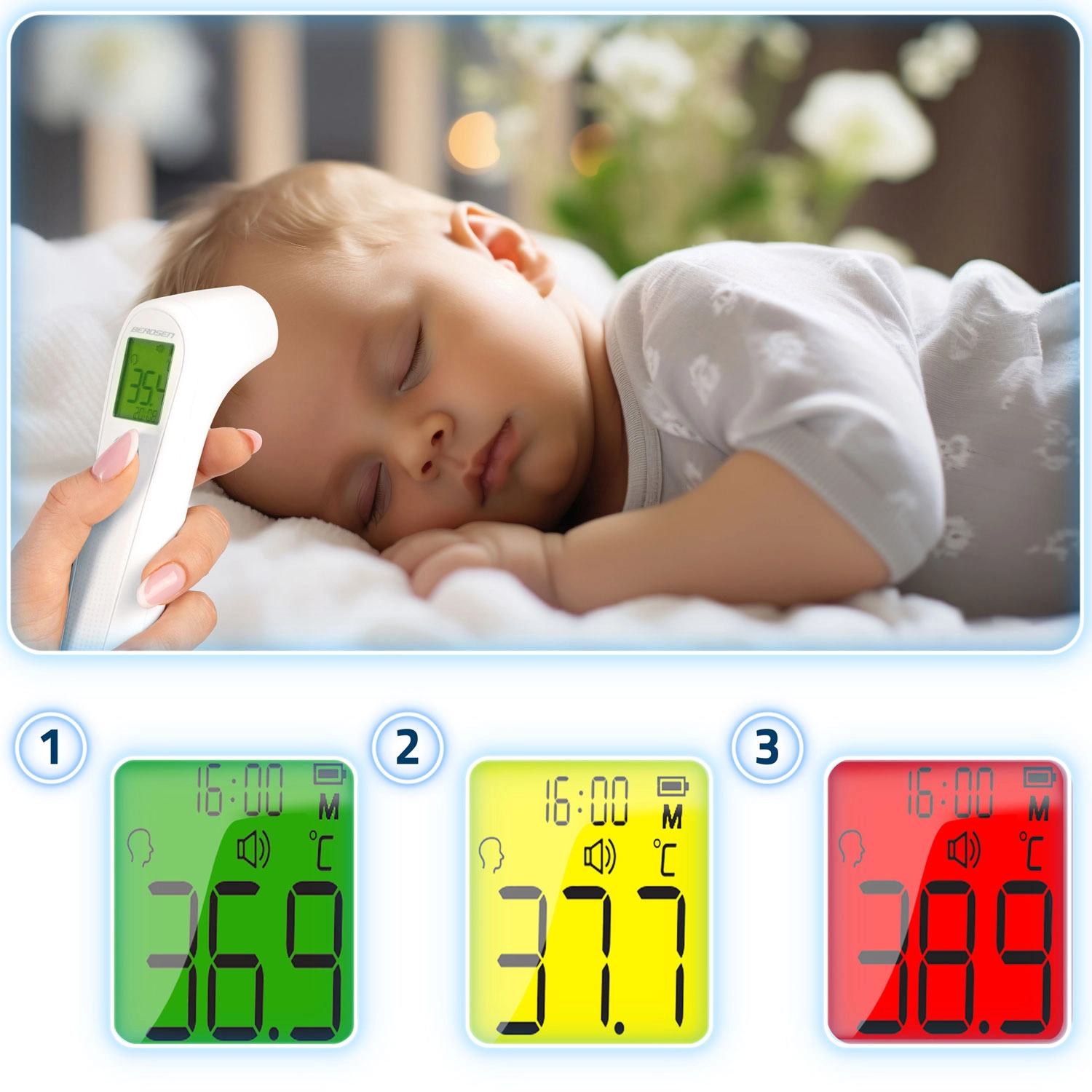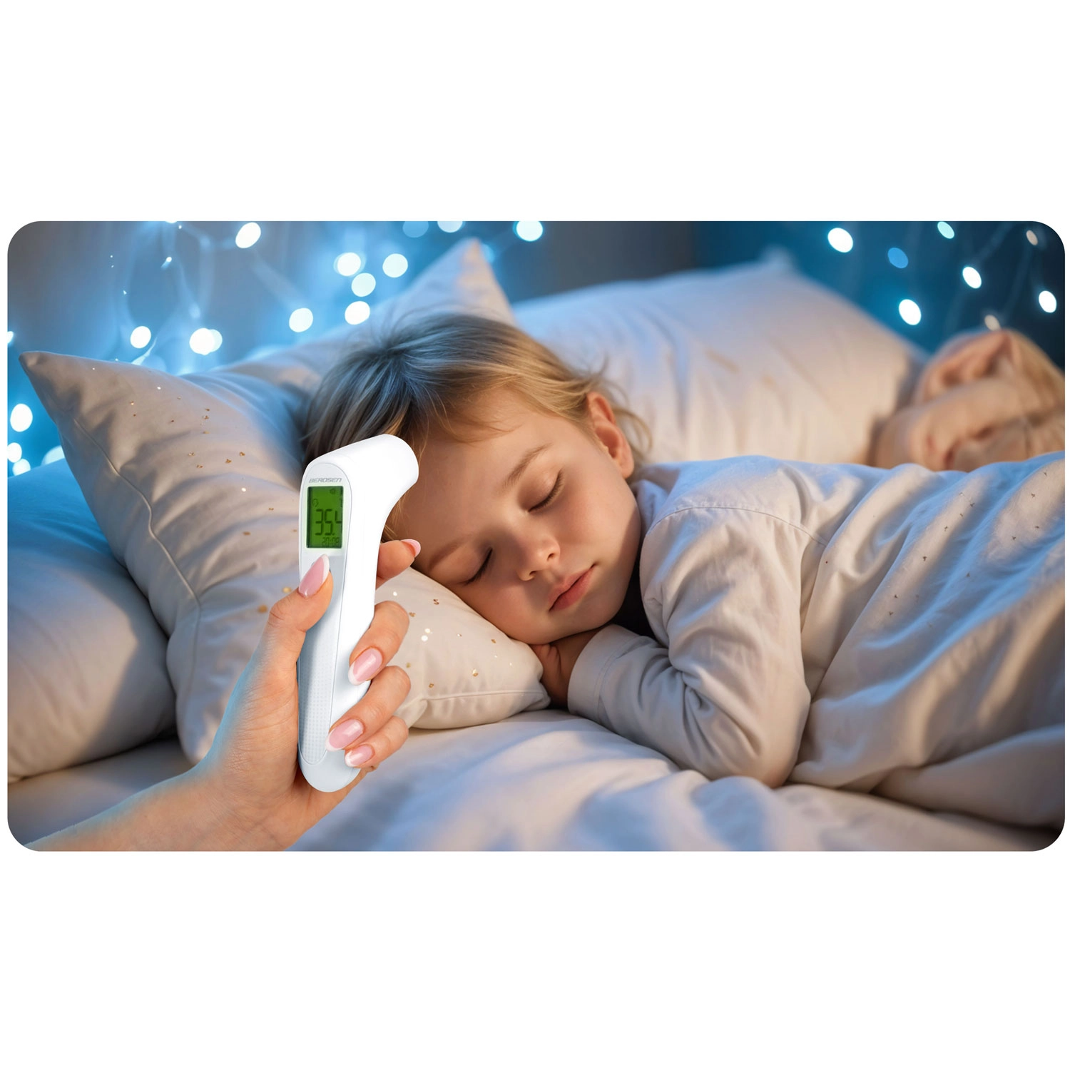 Měřte pohodlně i během spánku dítěte. Rychlé a hygienické zjištění teploty bez dotyku s pokožkou, ideální pro domácí i rychlý screening.