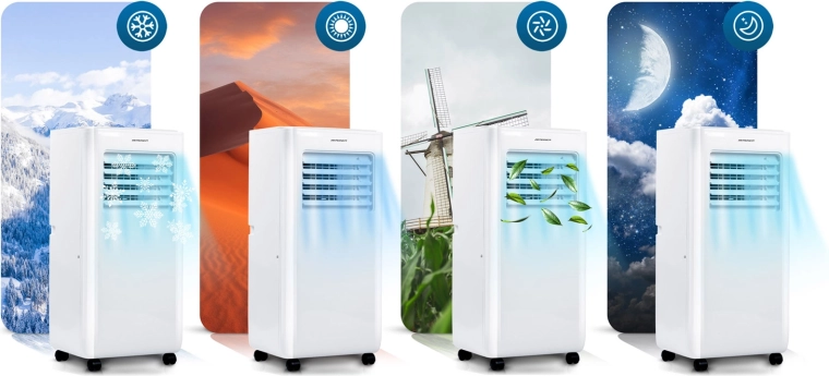 Zařízení nabízí režimy chlazení, odvlhčování (až 26 l/24 h), ventilace, AUTO a sleep. Ovládat jej můžete přes LCD dotykový panel, dodaný dálkový ovladač nebo aplikaci Tuya Smart (Wi‑Fi). Praktické funkce jako autostart, automatické odtávání, ochrana proti přeplnění nádrže a antibakteriální filtr zvyšují bezpečnost i hygienu provozu.