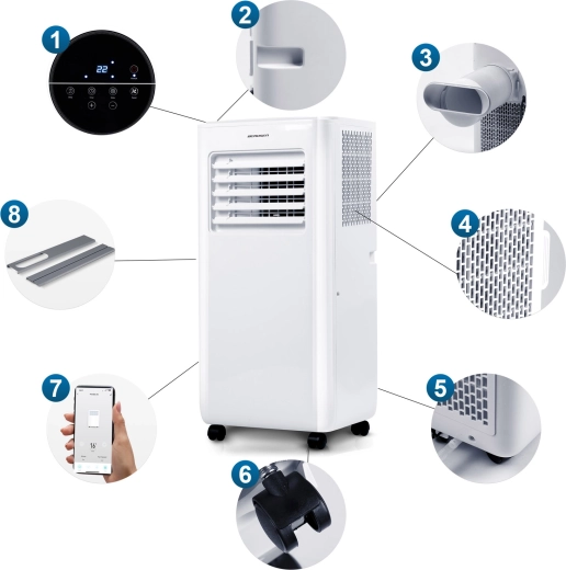 Ekologické chladivo R290 má nízké GWP a nepoškozuje ozonovou vrstvu. Díky kolečkům a madlům klimatizaci snadno přesunete, nastavitelná žaluzie vám umožní nasměrovat proudění vzduchu. Přiložená hadice a maskovací prvky usnadňují odvod horkého vzduchu mimo místnost.