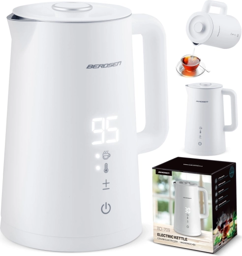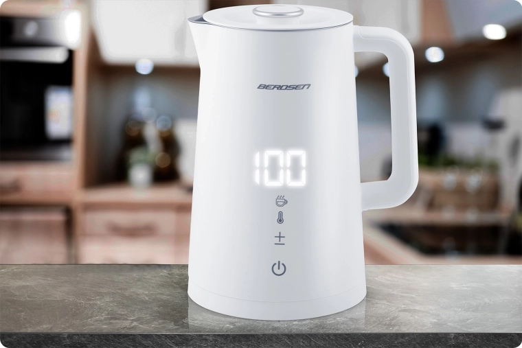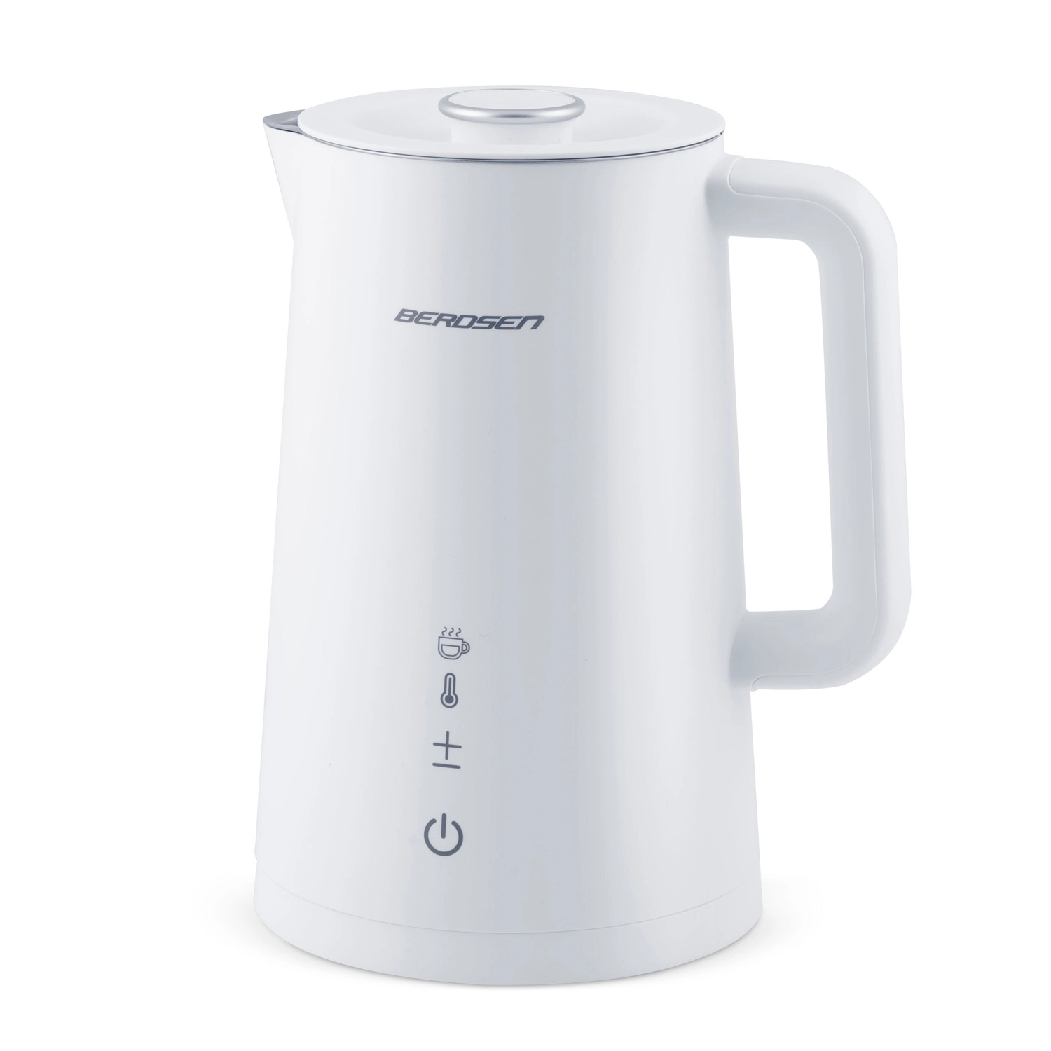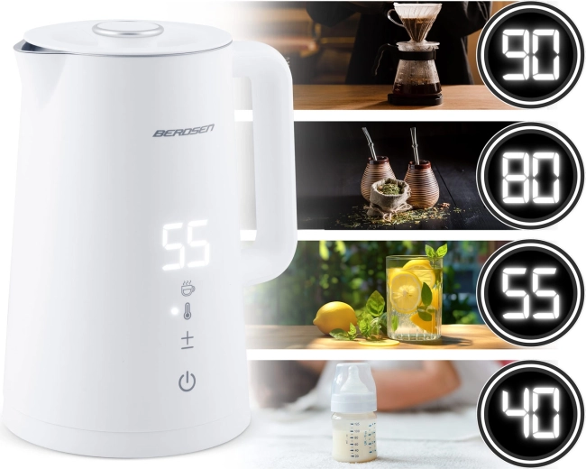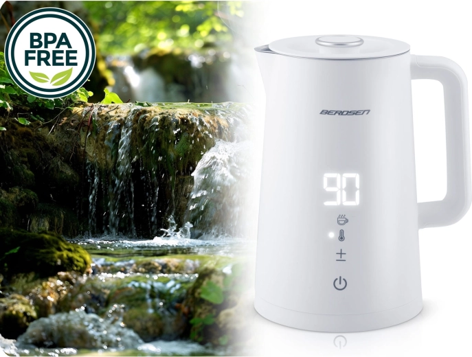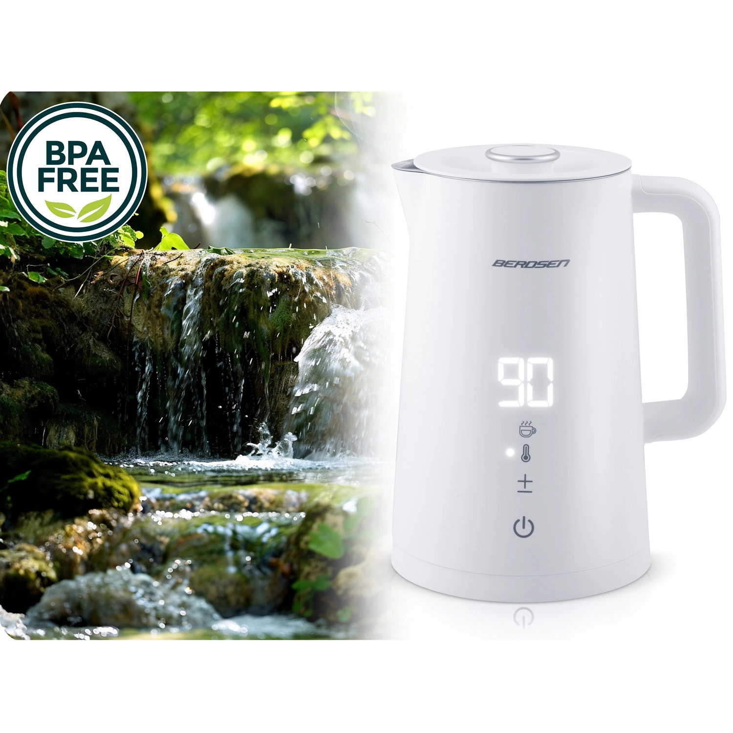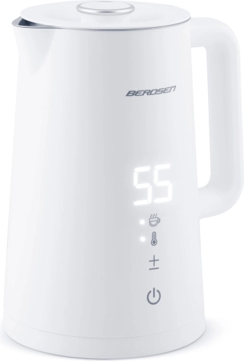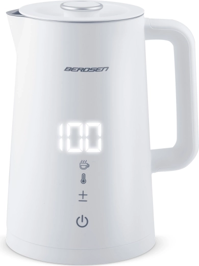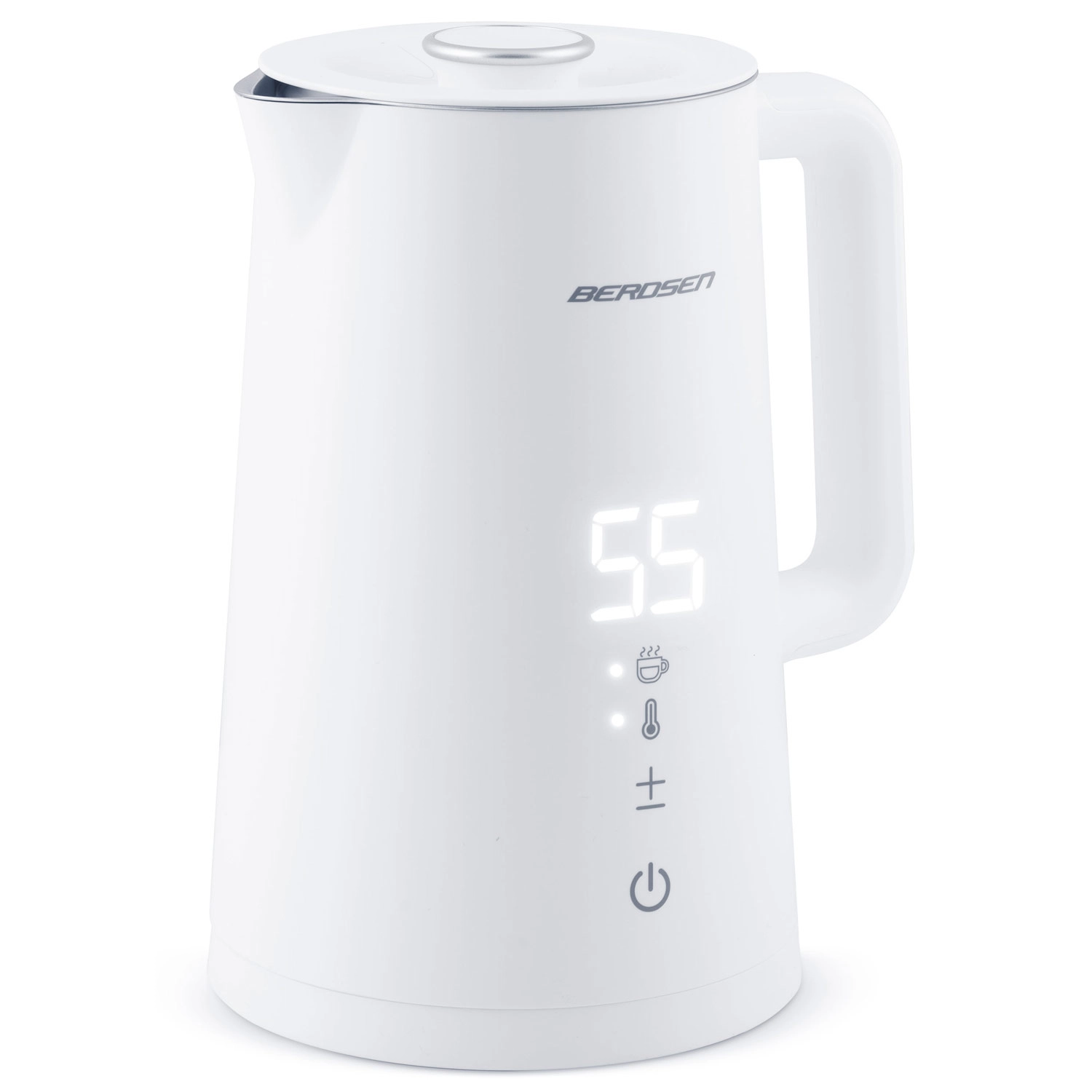 Stylová elektrická konvice BERDSEN o objemu 1,7 l nabízí přesné nastavení teploty v 5 úrovních, dotykový panel s LED displejem, funkci udržení teploty až 2 hodiny a bezpečnou dvoustěnnou konstrukci CoolTouch. Vnitřek z nerezové oceli SUS 304 zajišťuje čistou chuť vody a dlouhou životnost.