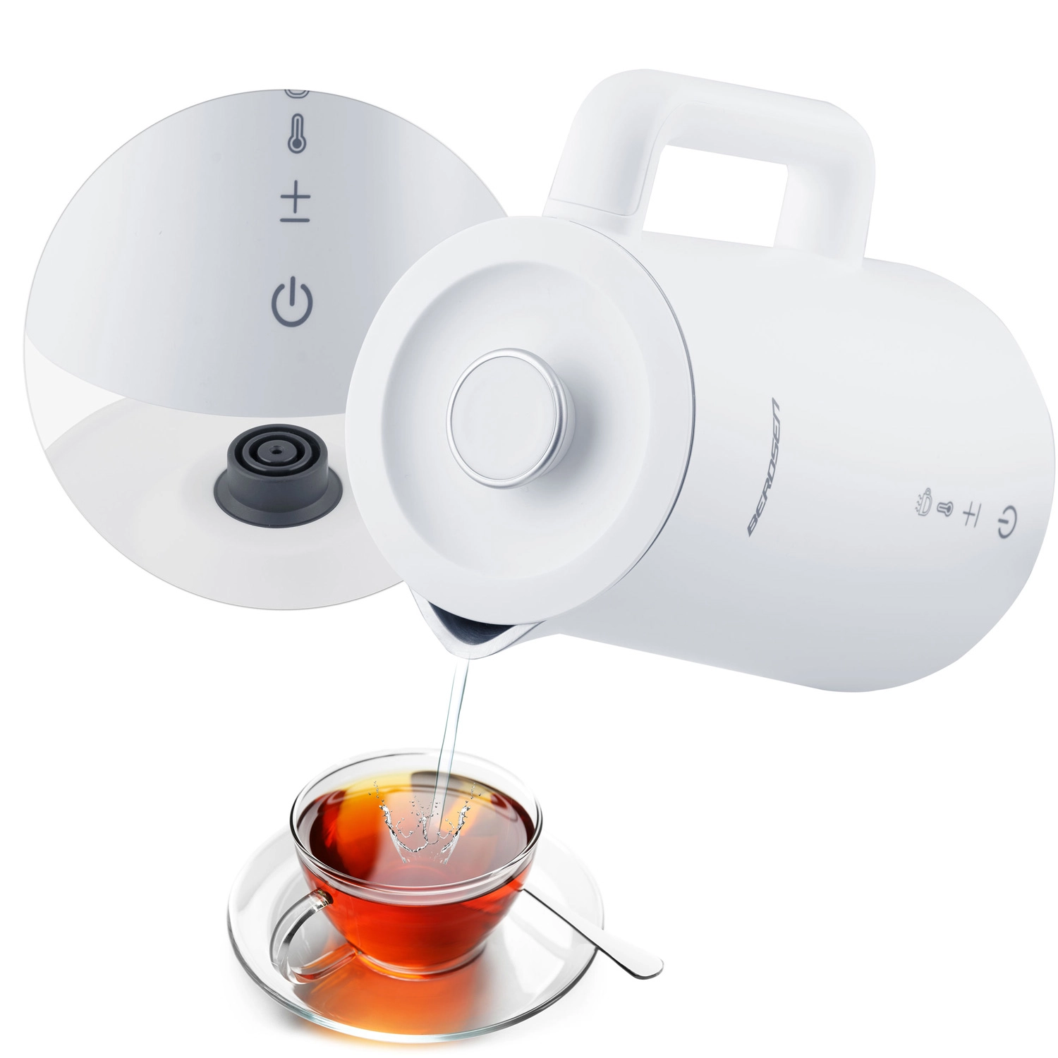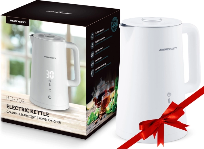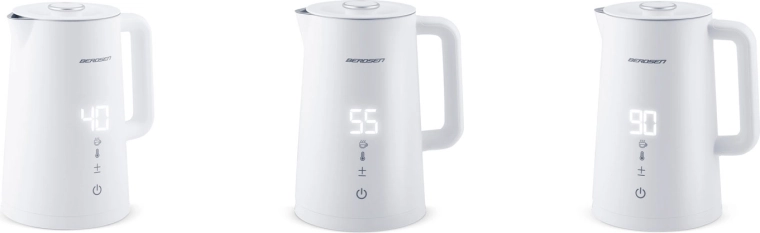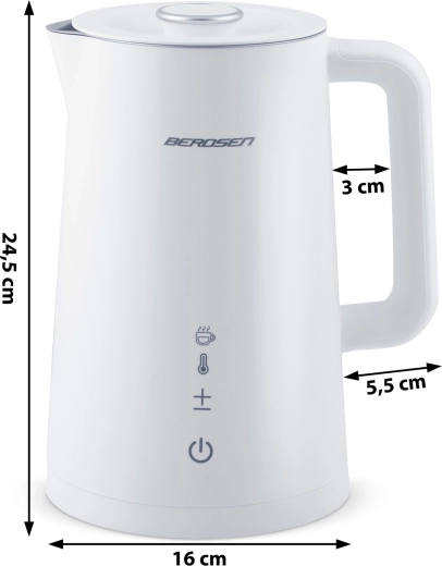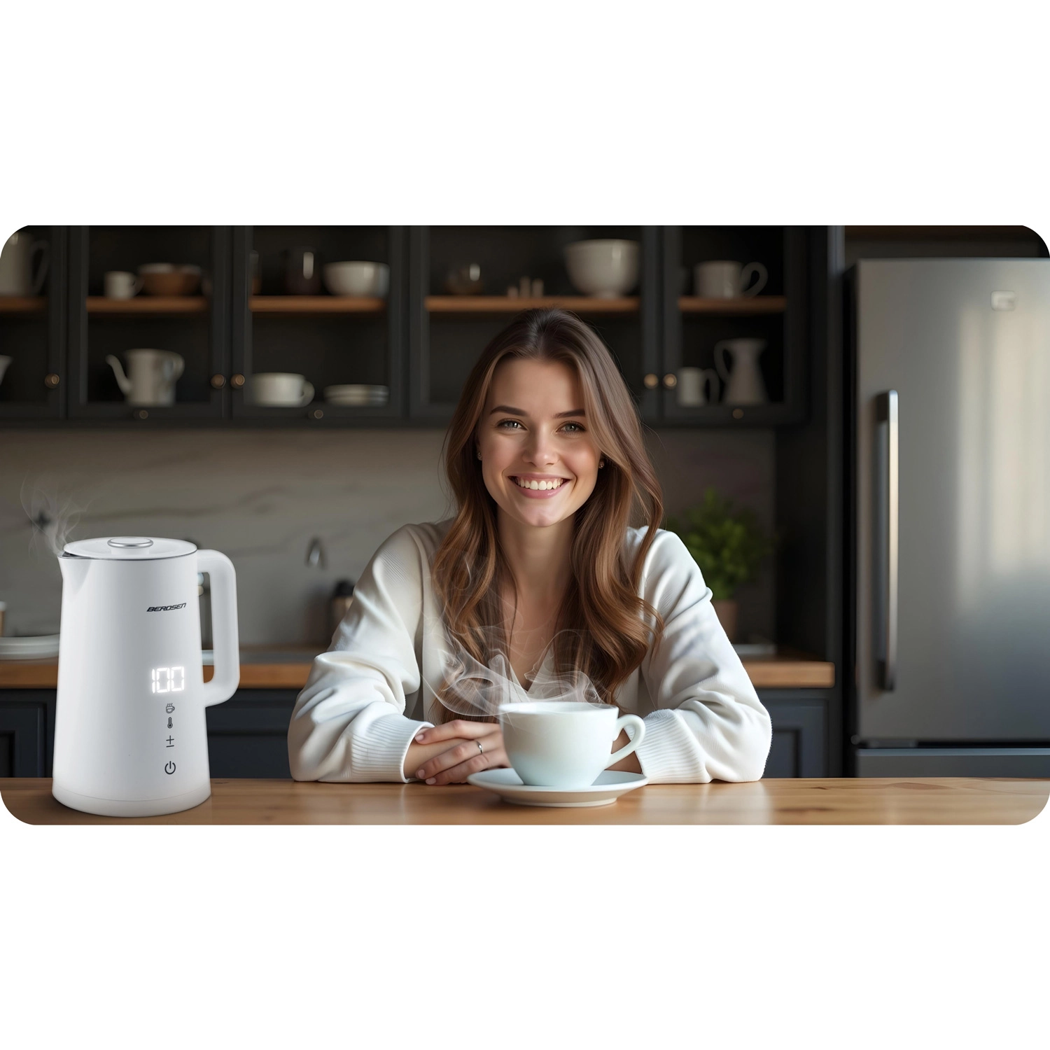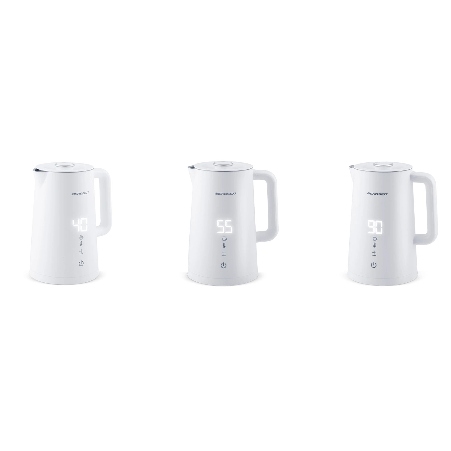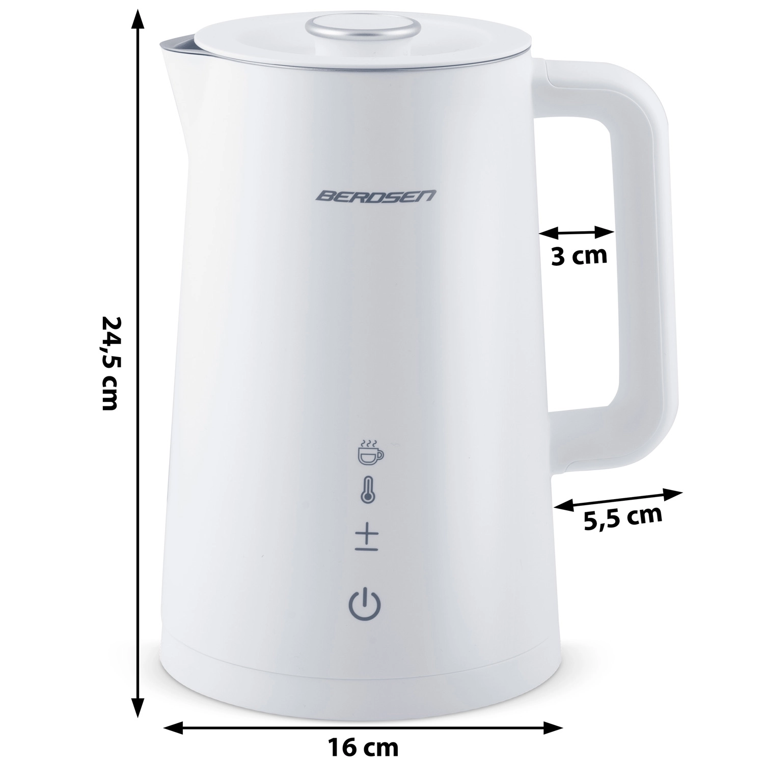 Stylová elektrická konvice BERDSEN o objemu 1,7 l nabízí přesné nastavení teploty v 5 úrovních, dotykový panel s LED displejem, funkci udržení teploty až 2 hodiny a bezpečnou dvoustěnnou konstrukci CoolTouch. Vnitřek z nerezové oceli SUS 304 zajišťuje čistou chuť vody a dlouhou životnost.