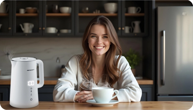 Užijte si pohodlné vaření vody s konvicí, která myslí na každý detail. Dotykové ovládání se zobrazením aktuální teploty umožňuje rychle zvolit ideální režim pro kávu, zelený čaj i dětské nápoje. Dvoustěnná izolace CoolTouch chrání před popálením a zároveň šetří energii díky lepší tepelné izolaci.