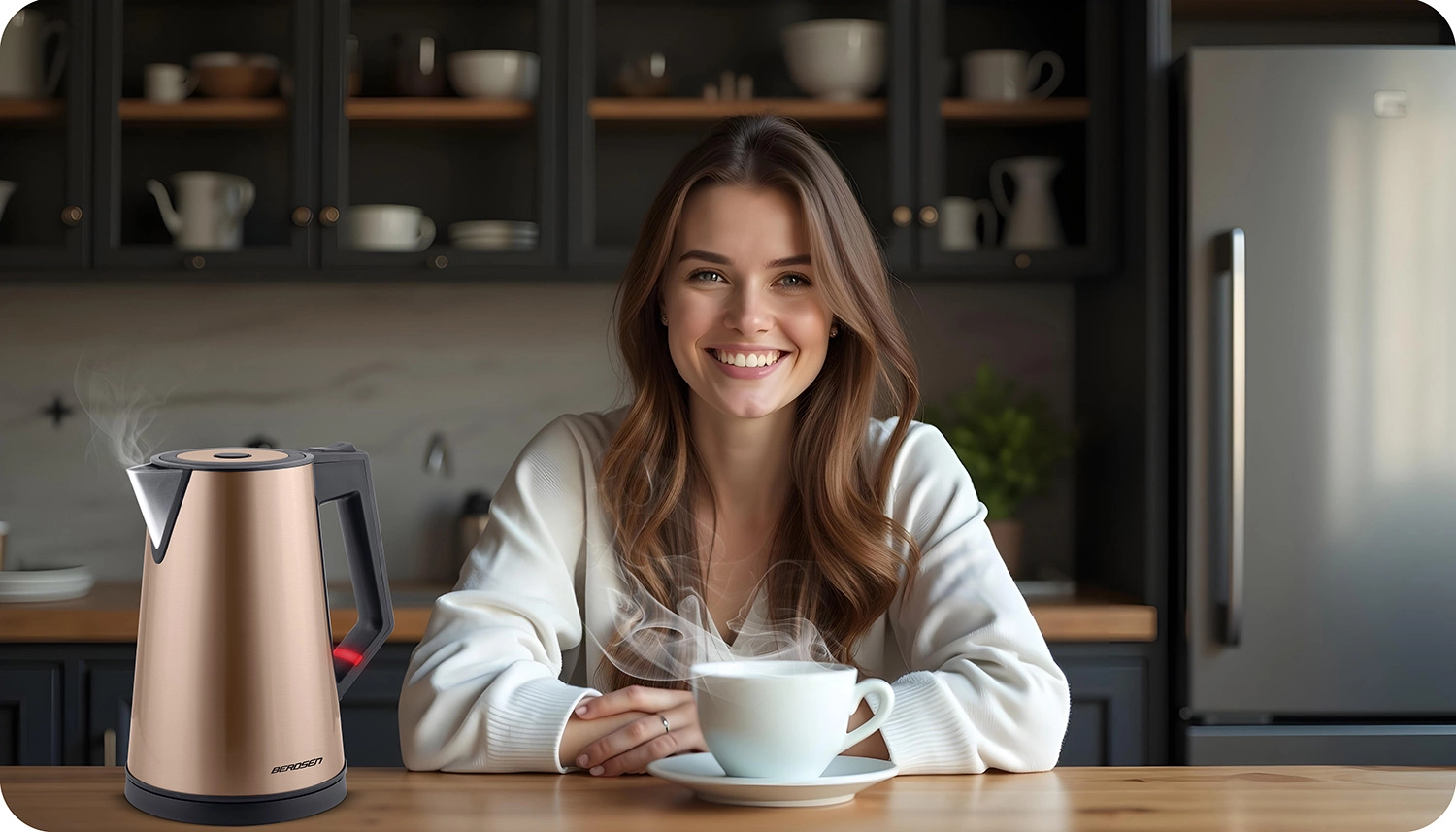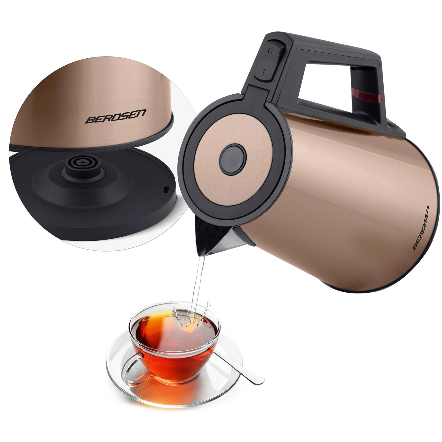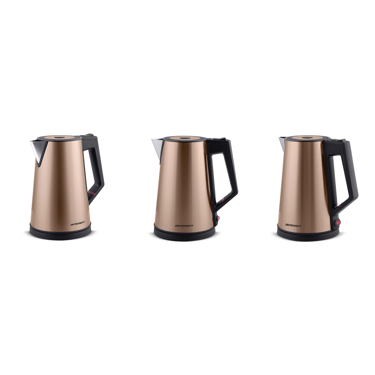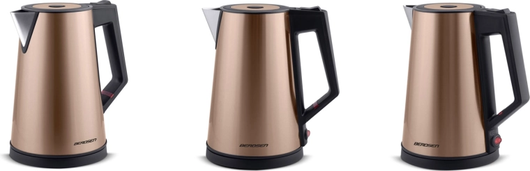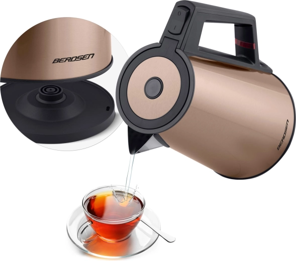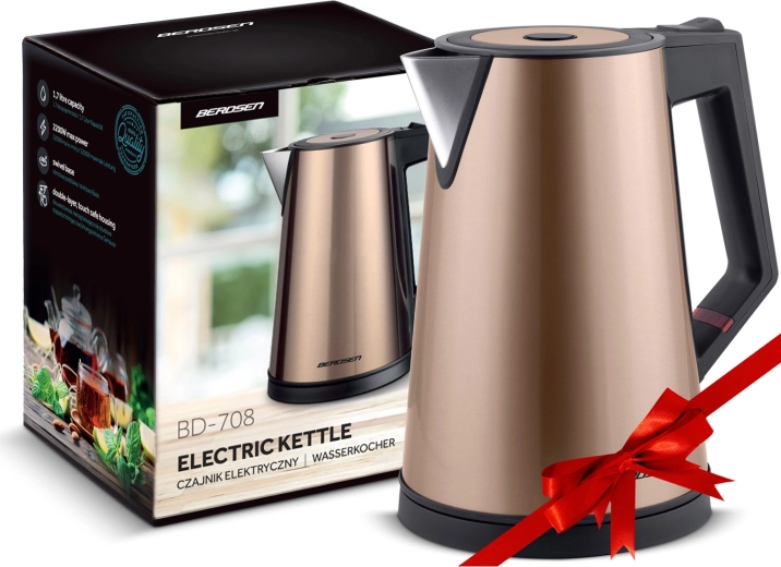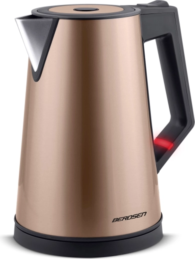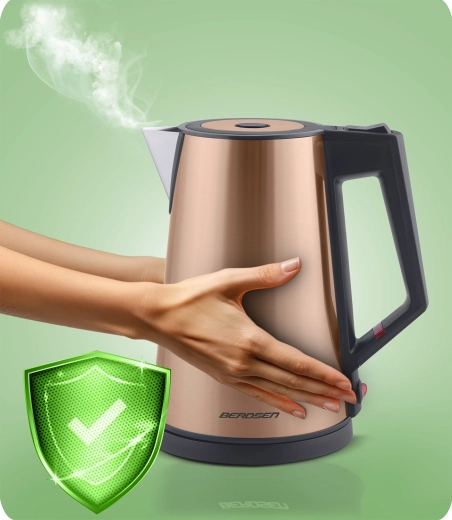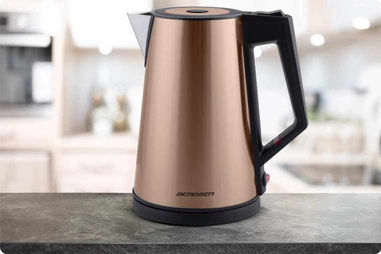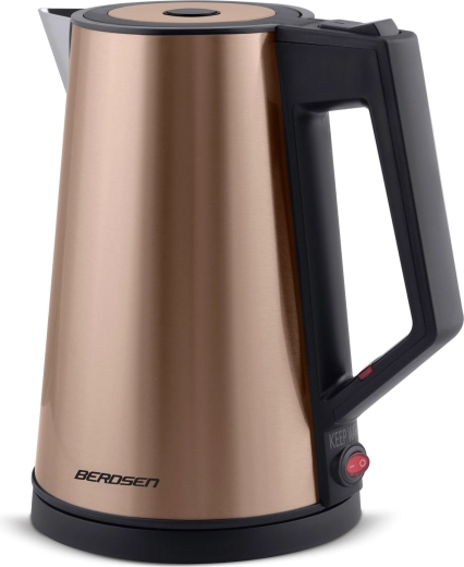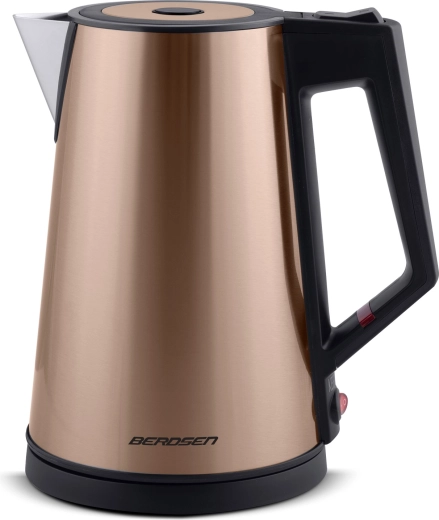 Stylová elektrická konvice BERDSEN o objemu 1,7 l v elegantním mděném provedení nabízí izolovanou CoolTouch™ konstrukci, vnitřek z nerezové oceli SUS 304 a praktickou funkci udržení teploty až 2 hodiny. Díky bezdrátové 360° základně, podsvícenému spínači a bezpečnostní ochraně proti přehřátí je ideální volbou pro každodenní vaření vody.