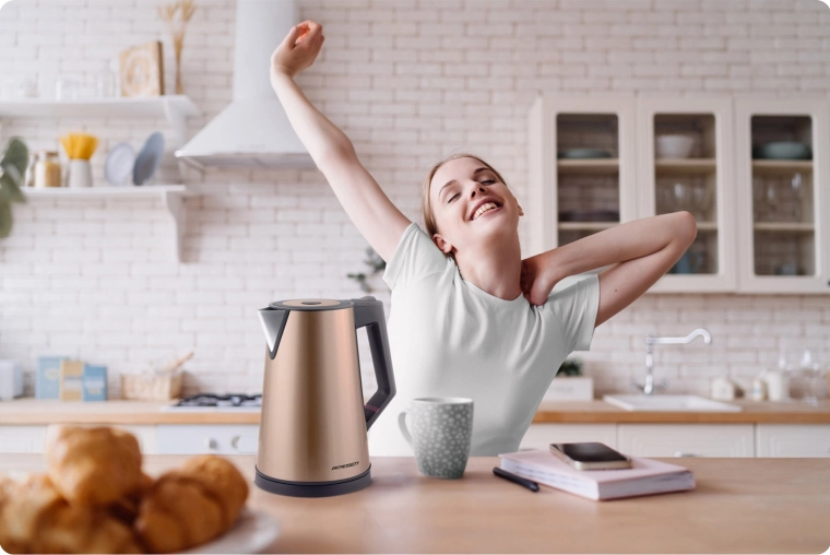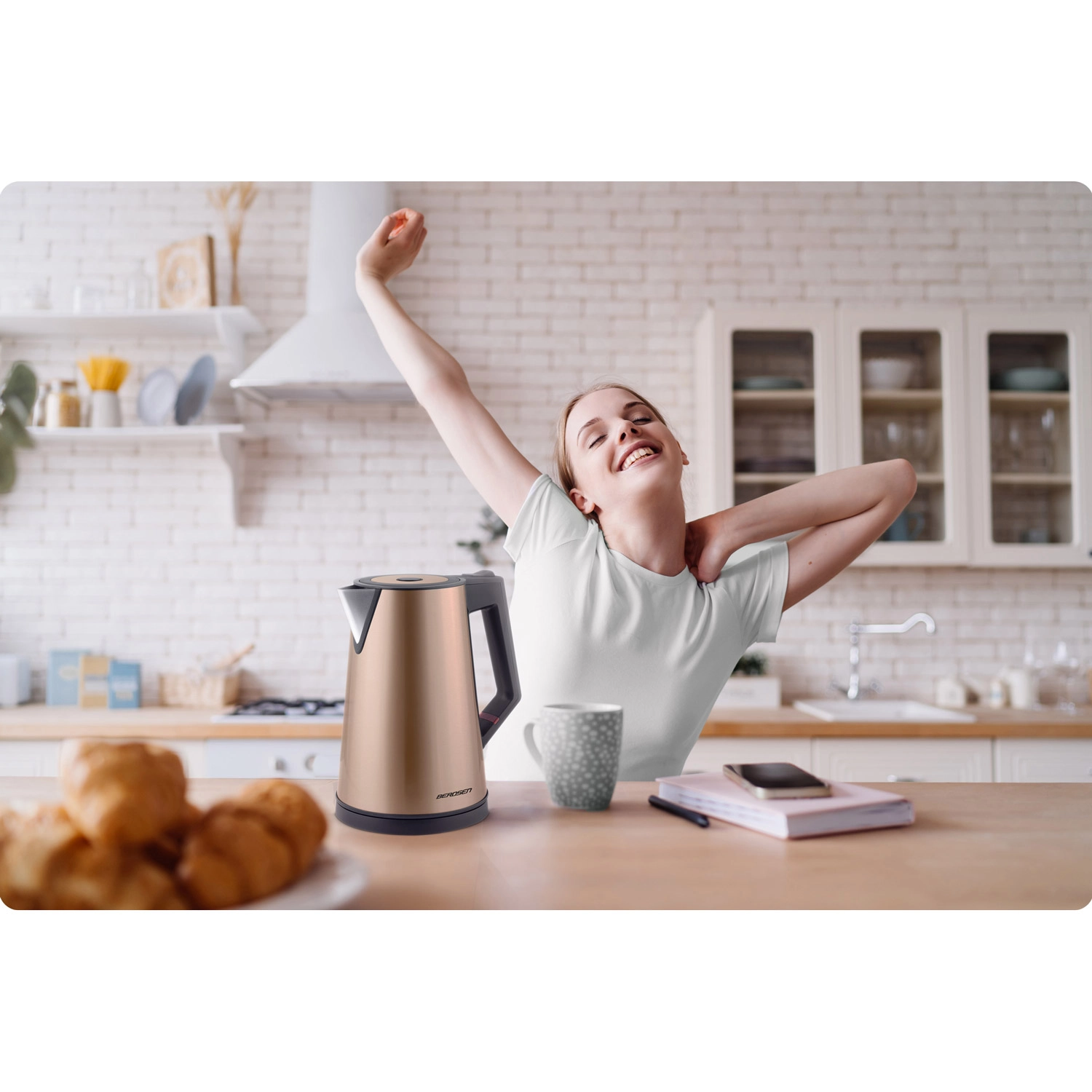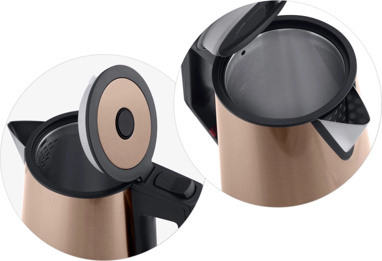 Objevte dokonale vyváženou kombinaci designu a funkčnosti. Dvouplášťová CoolTouch™ konstrukce zajišťuje, že se konvice zvenčí nepřehřívá, zatímco kvalitní nerez SUS 304 ve vnitřní nádobě garantuje čistou chuť vody bez nežádoucích pachutí. Měděně zlaté provedení působí prémiově a skvěle ladí s moderní kuchyní.