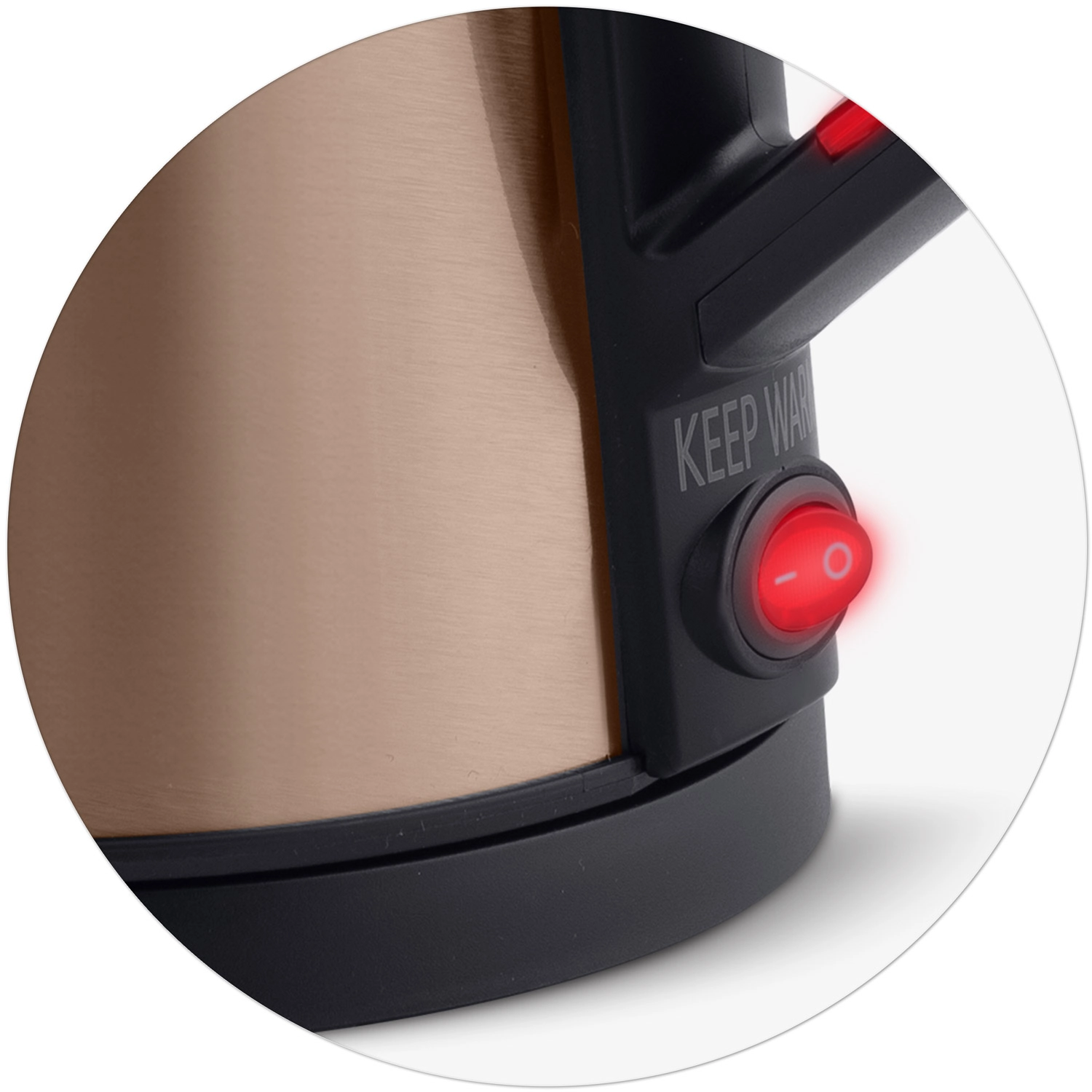 Praktická funkce KeepWarm udrží vodu kolem 55 °C až 2 hodiny – ideální pro čaj, kávu i dětské nápoje. Otočná 360° bezšňůrová základna s protiskluzovými nožkami a prostor pro navinutí kabelu usnadňují každodenní používání. Samozřejmostí je ochrana proti chodu nasucho a podsvícený vypínač pro jasnou kontrolu provozu.