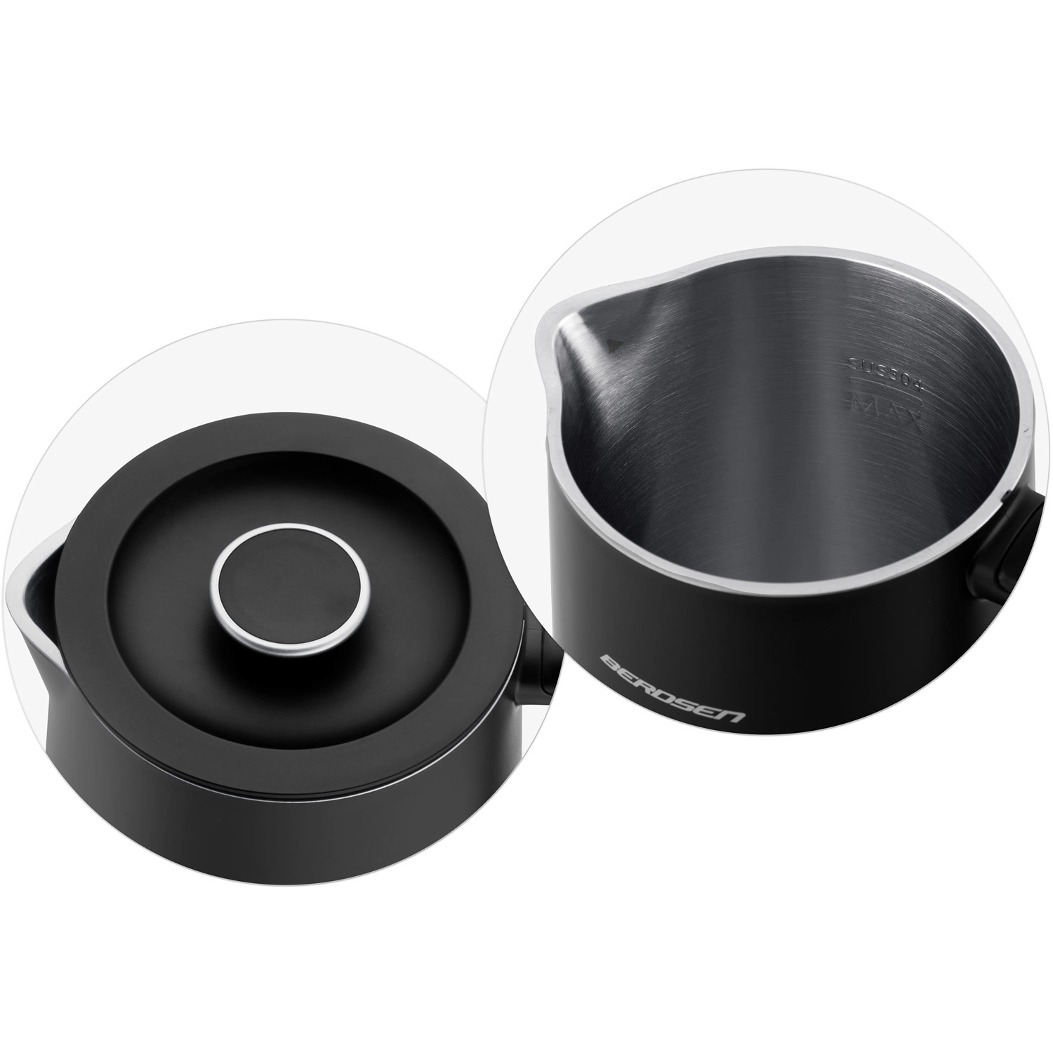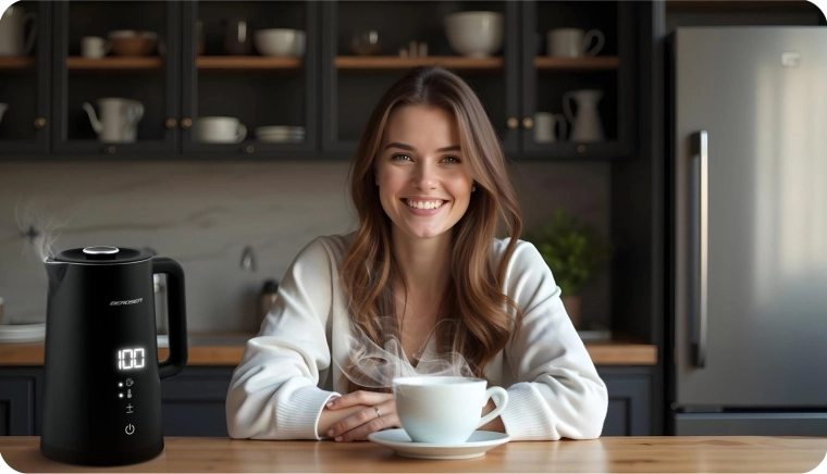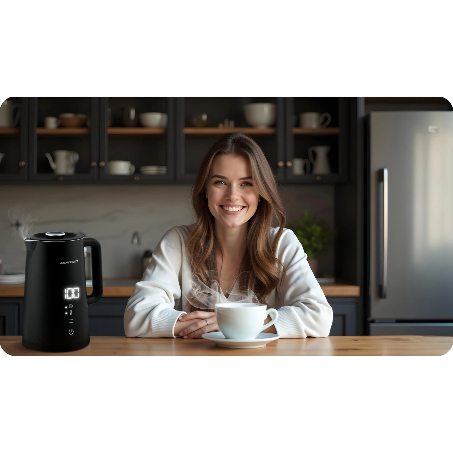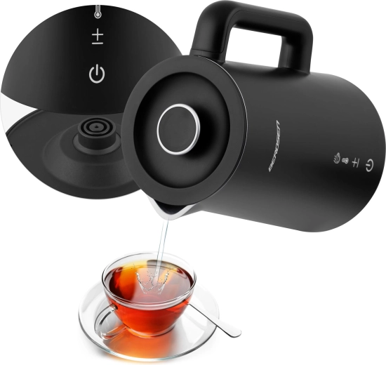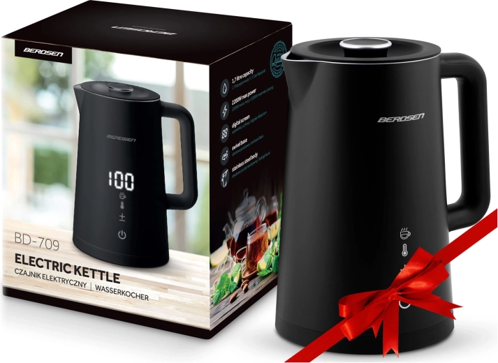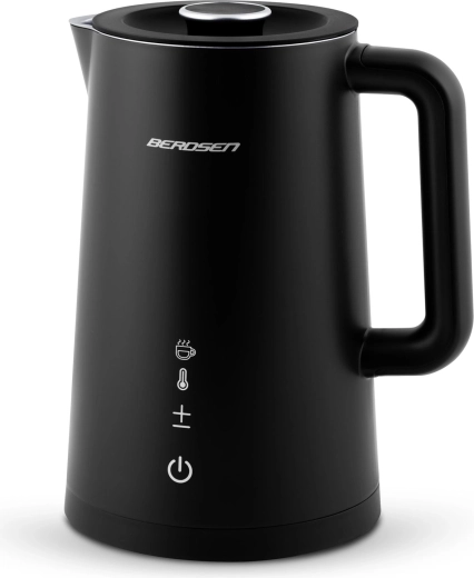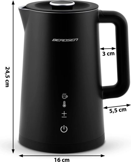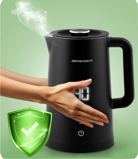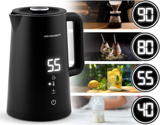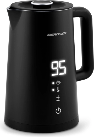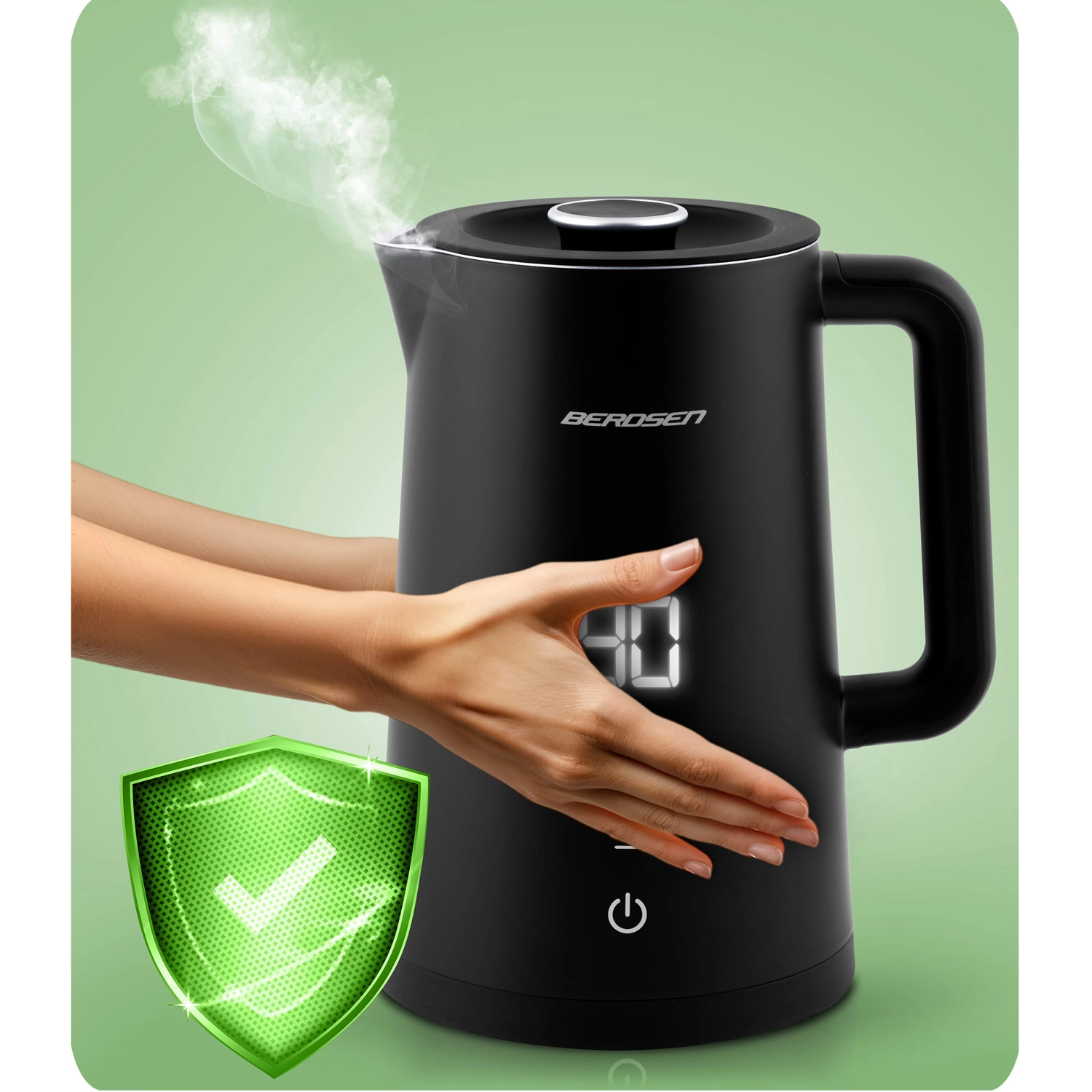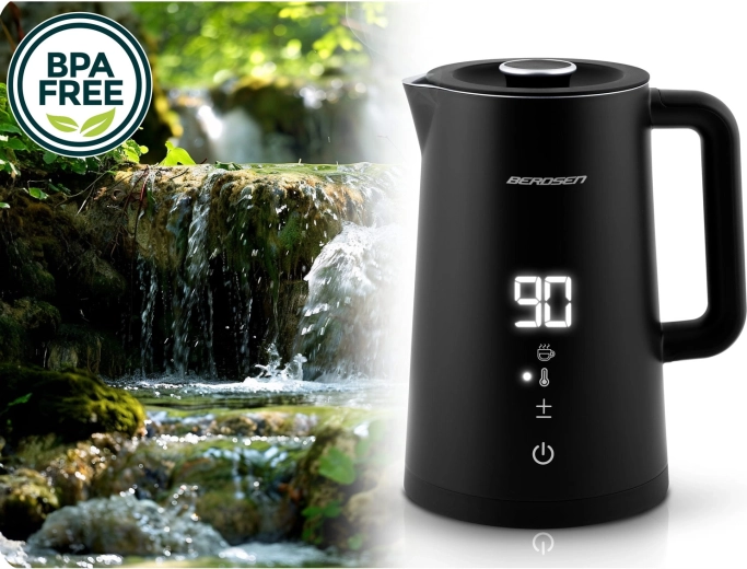 Stylová elektrická konvice BERDSEN s objemem 1,7 l nabízí dotykový panel s LED displejem, nastavení teploty v 5 krocích (40–100 °C) a funkci udržení teploty až 2 hodiny. Díky dvouvrstvé izolované konstrukci CoolTouch se povrch nezahřívá, vnitřní nádoba z nerezové oceli SUS 304 zajišťuje čistou chuť vody bez BPA. Praktická 360° otočná základna, protiskluzové nožky a odnímatelné víko zaručují pohodlné každodenní používání.