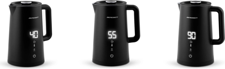 - Nastavení teploty v 5 stupních: 40 °C (mléko, dětské nápoje), 55 °C (voda s citronem a medem), 80 °C (yerba mate, zelený čaj), 90 °C (darjeeling, oolong, alternativní káva), 100 °C (vaření, spařování nádobí).