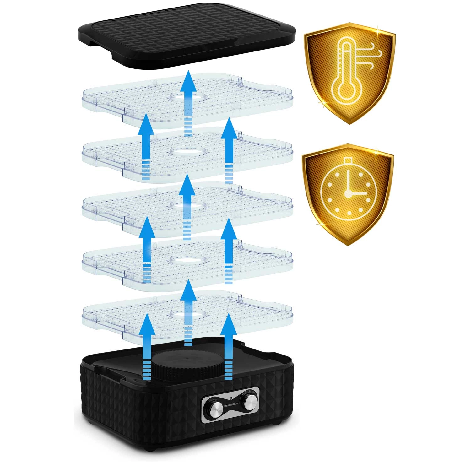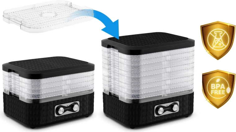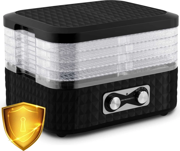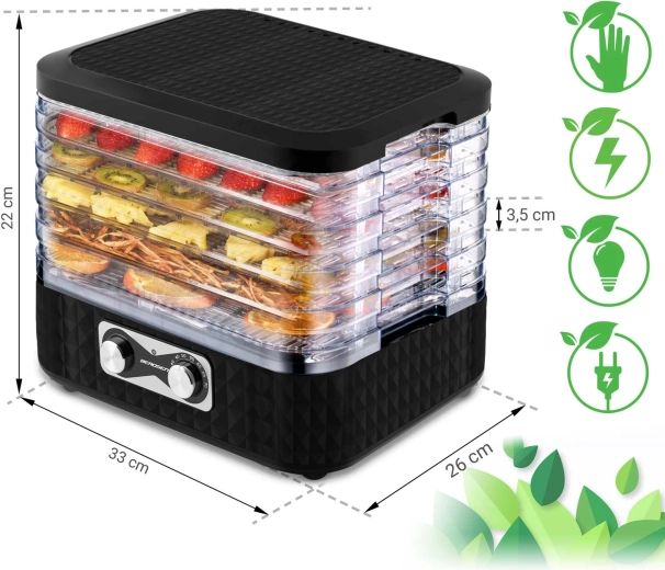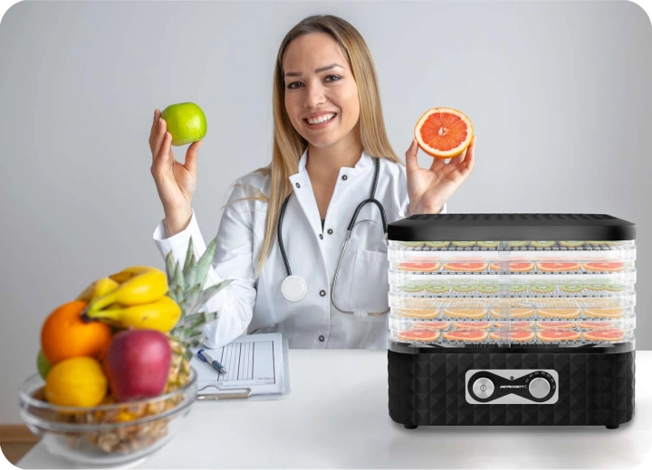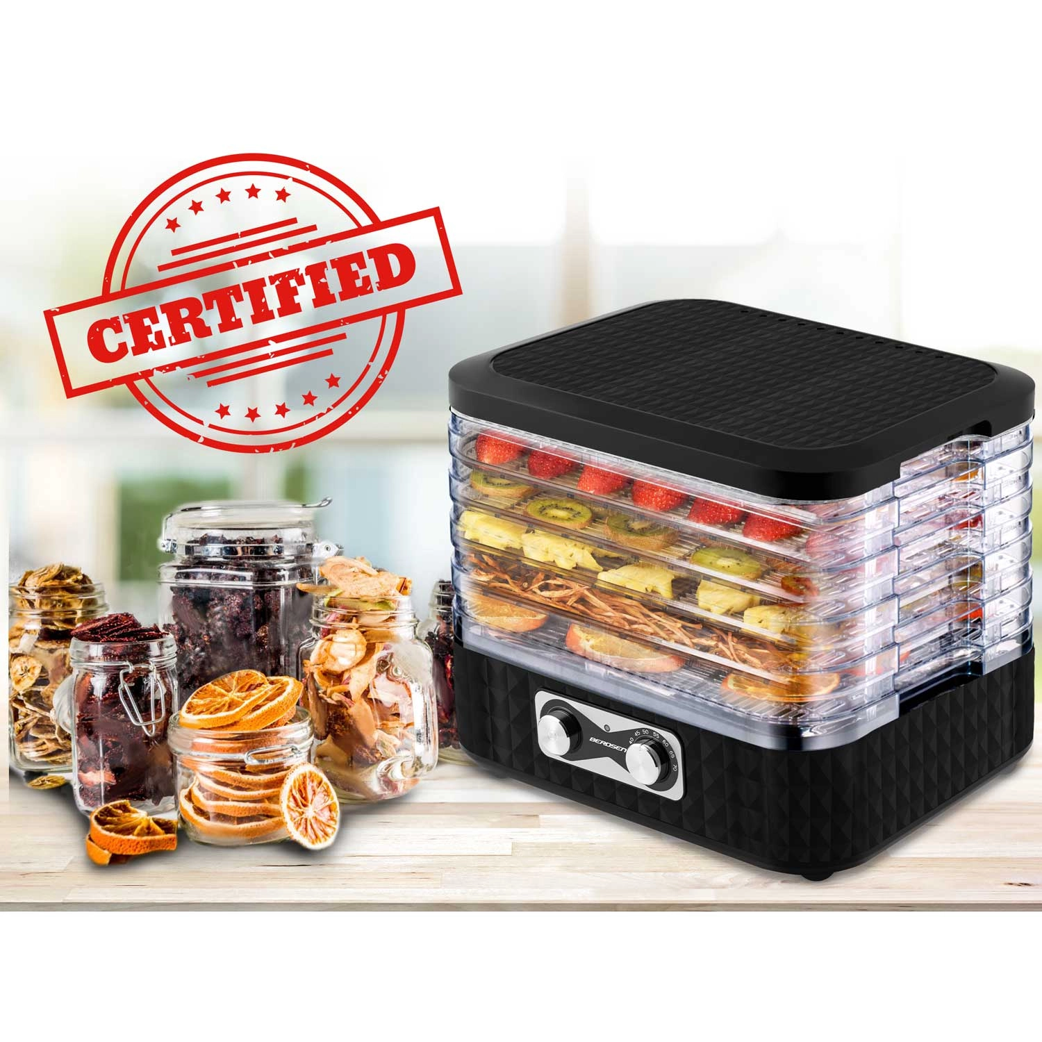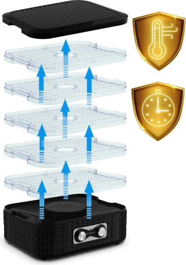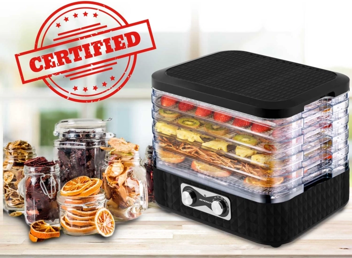 Díky nastavení teploty v rozsahu 35–70 °C přizpůsobíte sušení konkrétním potravinám – od šetrného sušení bylin až po intenzivnější sušení zeleniny a masa. Bezpečný provoz podporují certifikace CE a RoHS a integrované tepelně-bezpečnostní prvky.