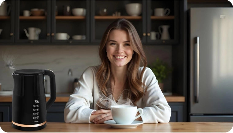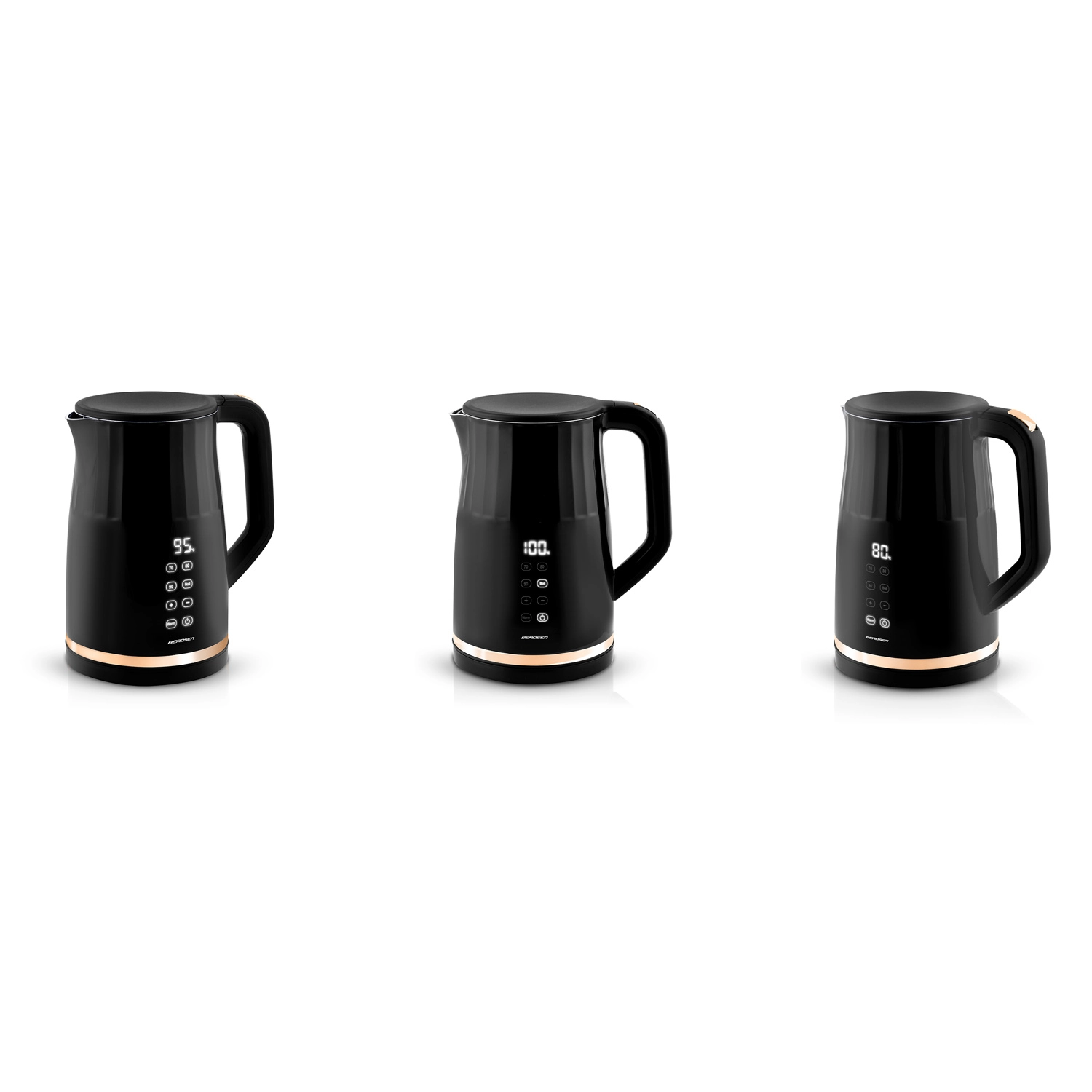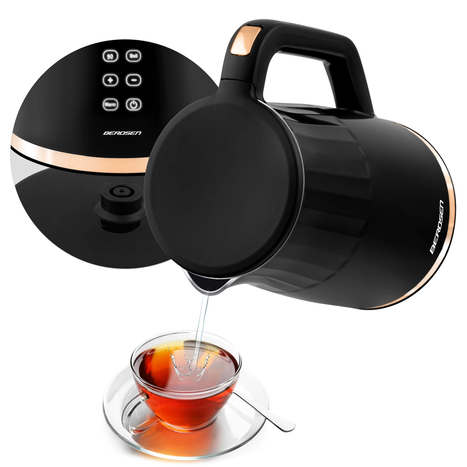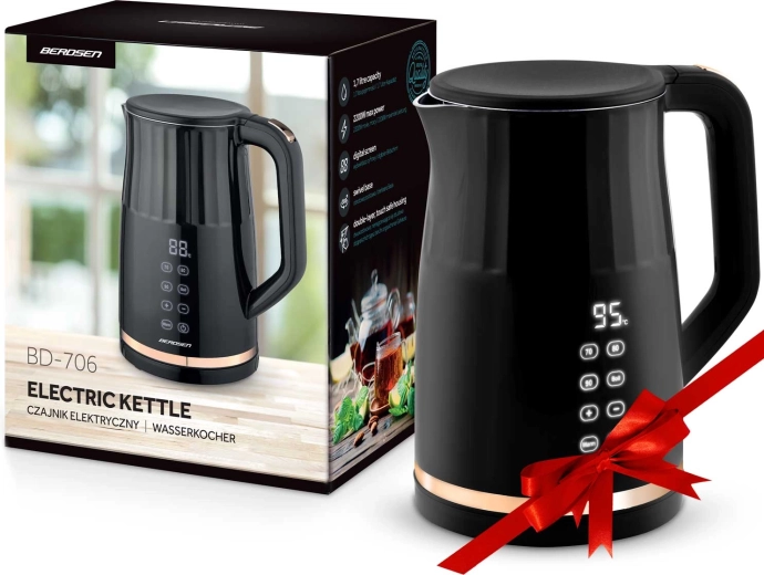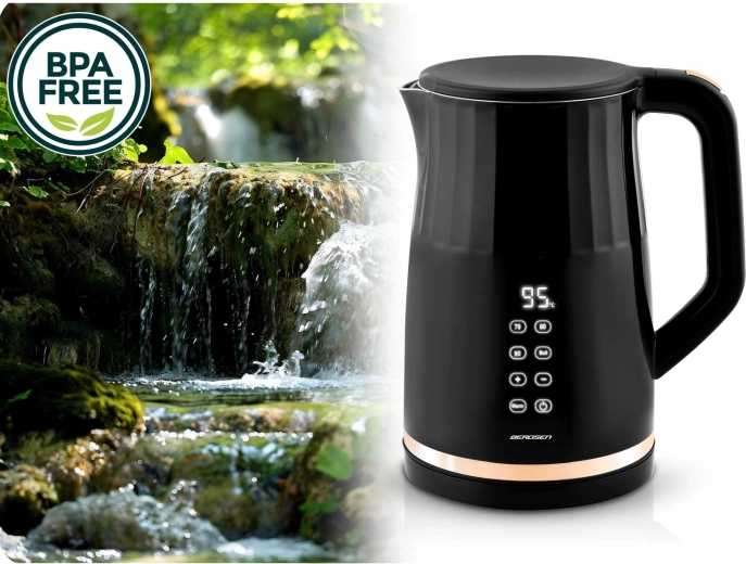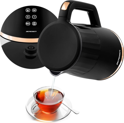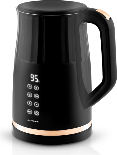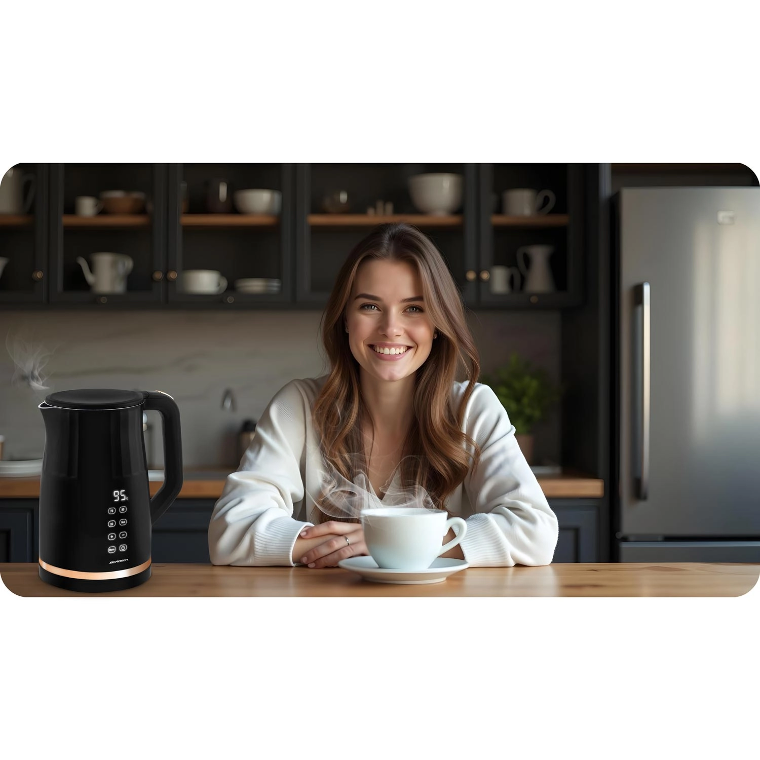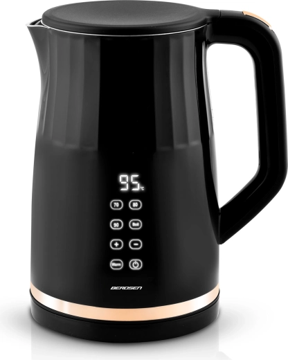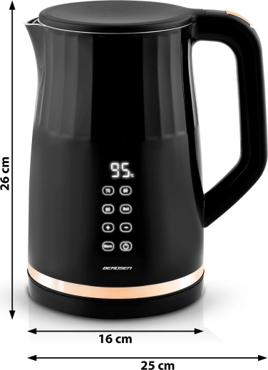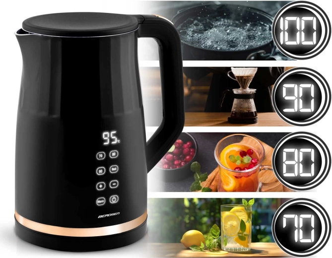 Užijte si přesné ohřátí vody pro čaj, kávu i bylinkové nálevy. Dotykové ovládání se snadno používá a přehledný displej ukazuje aktuální teplotu v reálném čase. Konvice BERDSEN kombinuje elegantní černý design s kovovými akcenty, ergonomické držadlo a bezpečný provoz díky ochraně proti chodu nasucho.