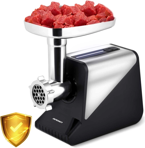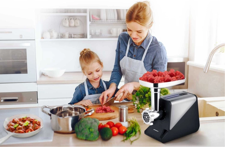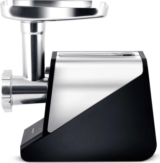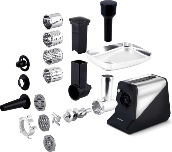 Motor 800 W (max. 2000 W) s funkcí zpětného chodu zajistí rychlé zpracování masa i tužších surovin bez ucpávání. Tři kotouče 3/5/7 mm pro přesnou texturu.
