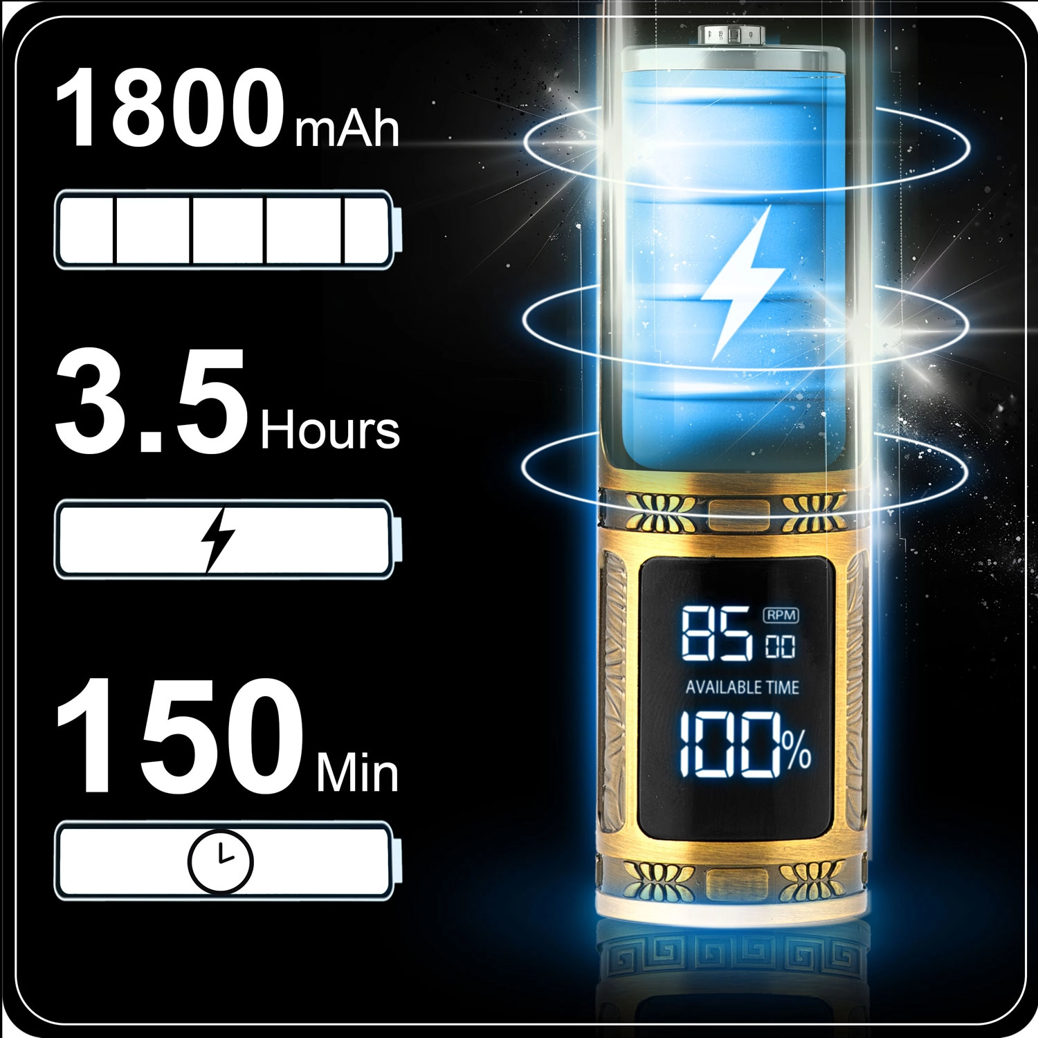 LCD displej zobrazuje stav baterie a rychlost, takže máte nad stříháním plnou kontrolu. Li‑Ion baterie 1800 mAh poskytne až 2,5 hodiny nepřetržité práce, nabíjení přes USB‑C trvá přibližně 3,5 hodiny. V balení najdete také 6 nástavců (1,5–9 mm) pro plynulé přechody a různé délky, plus čistící kartáček a USB‑C kabel.