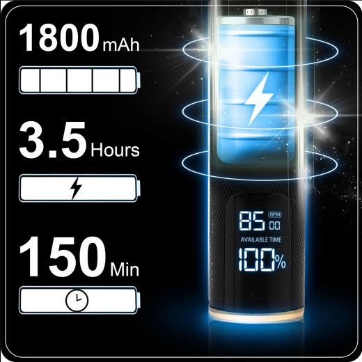 Sledujte procenta baterie i čas/otáčky na přehledném displeji. Až 2,5 hodiny bez kabelu, nabíjení USB‑C a voděodolné tělo pro snadné čištění.