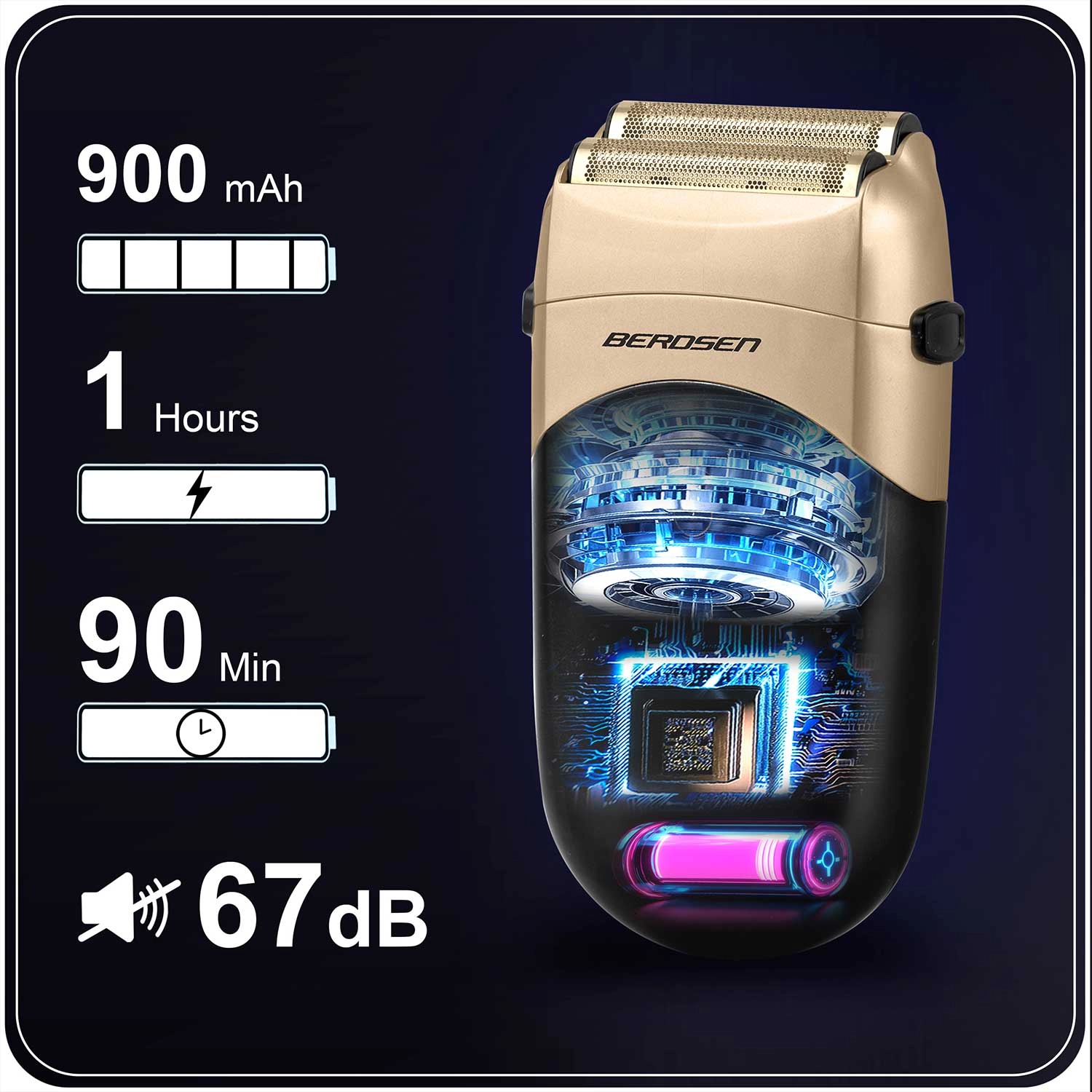 Výkonný fóliový holicí strojek BERDSEN pro hladké oholení a přesné dokončovací úpravy. Nabízí silný motor 6500–7000 RPM, podsvícený LCD displej s ukazatelem baterie, duální ocelové fólie pro šetrné a efektivní holení a baterii Li‑Ion 900 mAh až na 60 minut bez kabelu. Rychlé nabíjení USB‑C (1,5 h), ergonomický design a praktické příslušenství v balení.