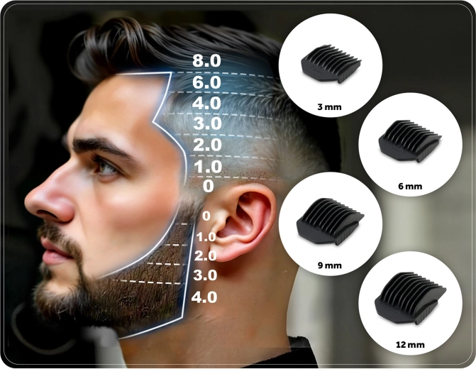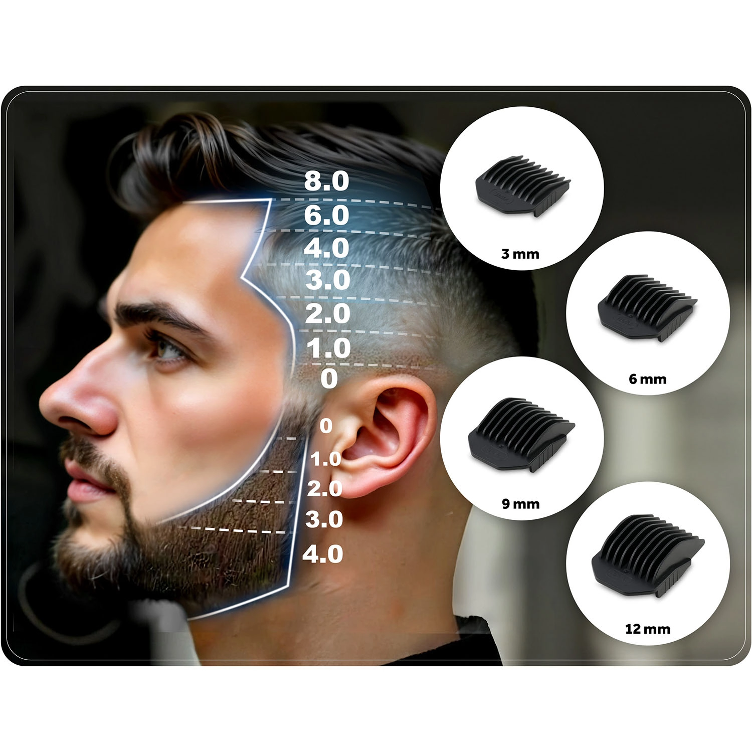 Čtyři hřebenové nástavce umožní hladké přechody, různé délky střihu a univerzální použití pro vlasy i vousy.