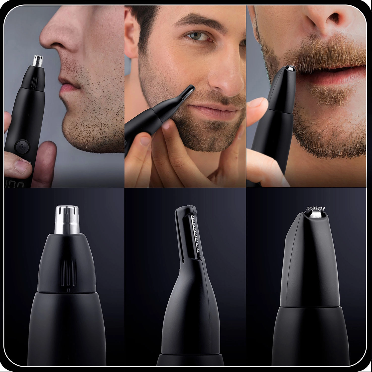 - 3 vyměnitelné hlavy: rotační hlava pro nos a uši, široká hlava na rychlé holení větších ploch (tváře, krk) a precizní hlava na detaily, kontury kotlet a kníru.