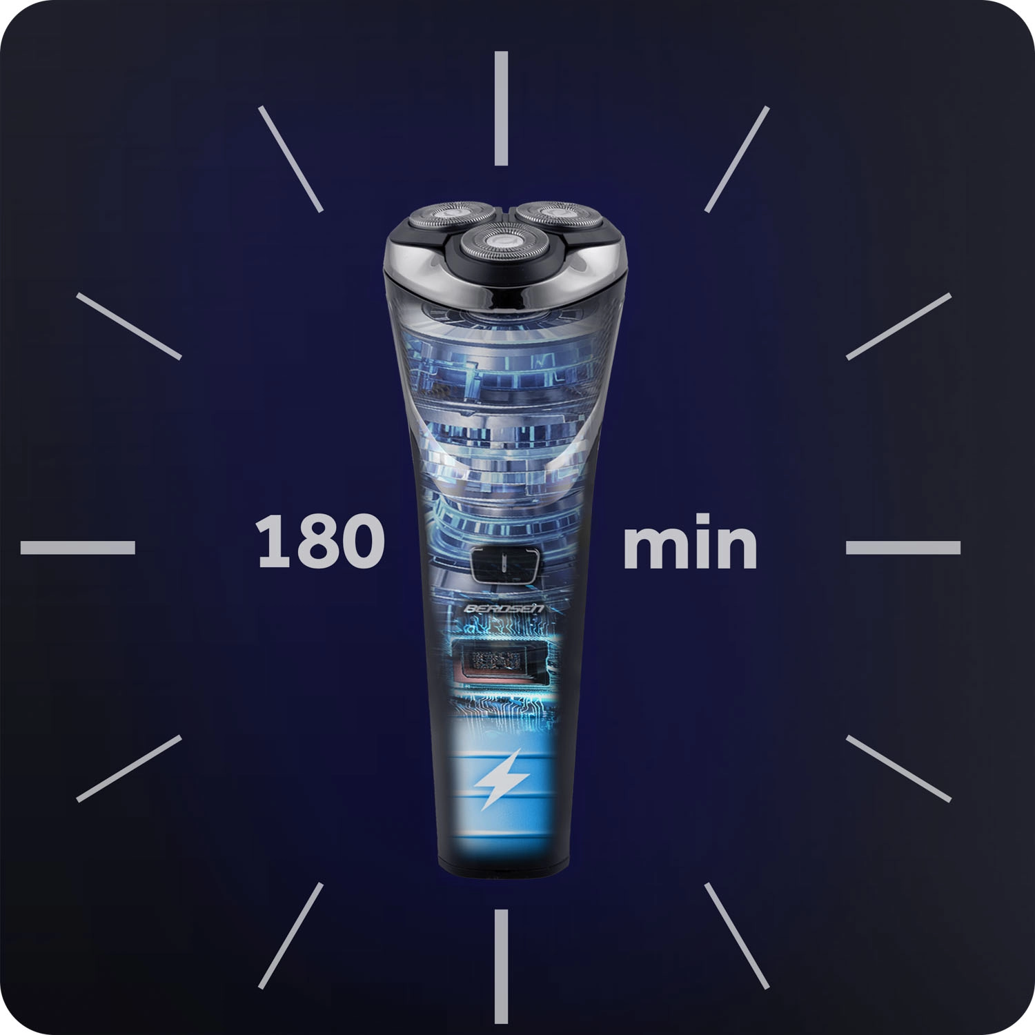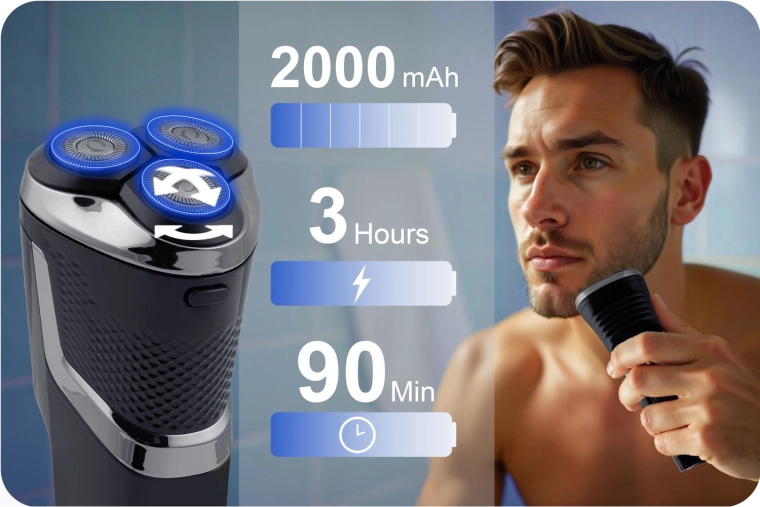Trojitá rotační hlava z nerezové oceli se přizpůsobí liniím obličeje a zajistí rychlé, šetrné a důkladné oholení každý den.
