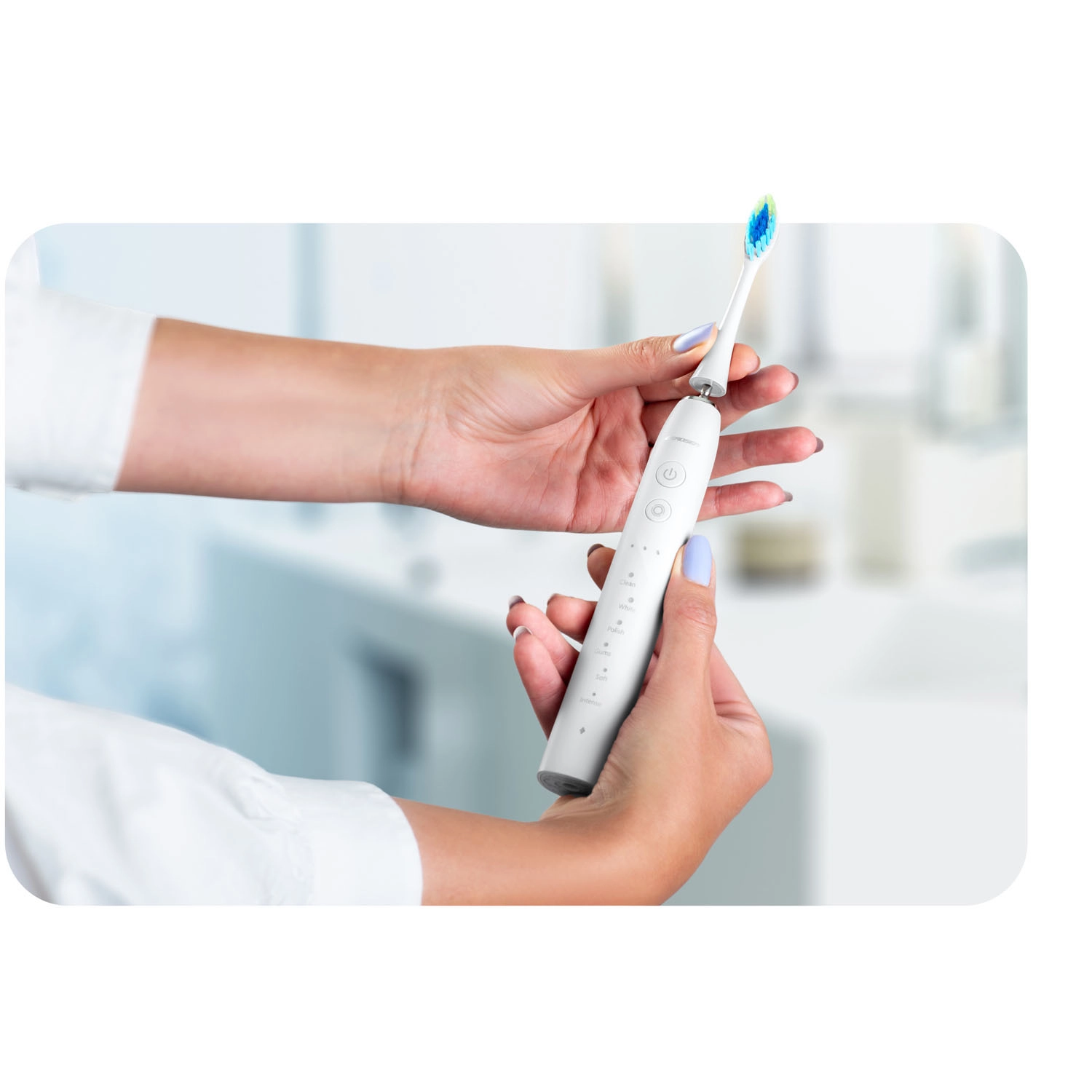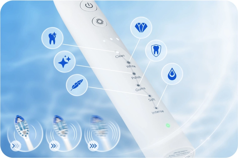 - 6 režimů: Clean (denní čištění), White (bělení), Polish (leštění), Gums (péče o dásně), Soft (jemný), Intense (hloubkové čištění)