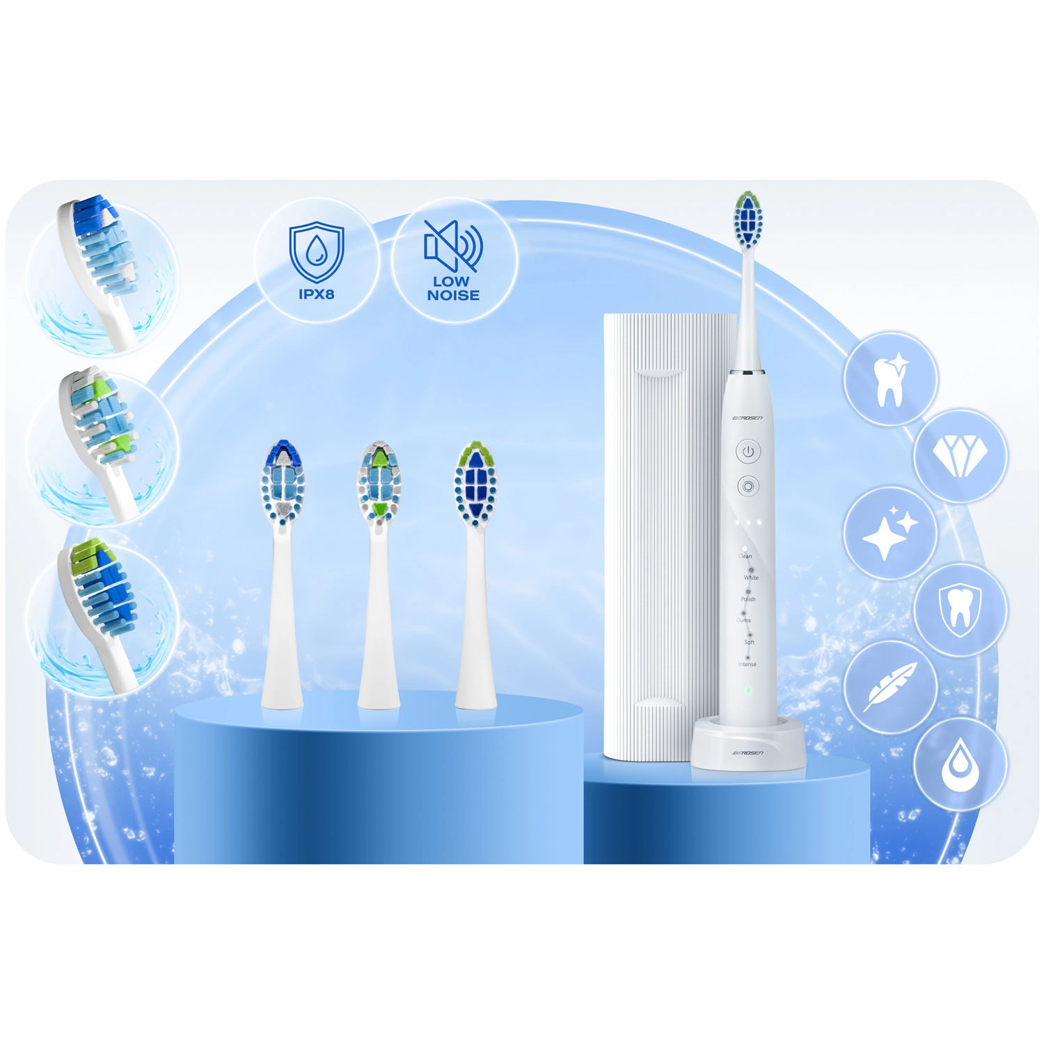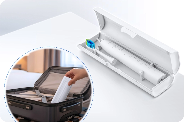 Vyberte si ze 6 režimů a 3 intenzit (celkem 18 kombinací) pro péči přesně podle vašich potřeb – od každodenního čištění až po jemnou péči o citlivé dásně. Silná baterie s kapacitou 800 mAh vydrží přibližně 50 dní na jedno nabití a díky indukční základně USB je nabíjení snadné a stylové. Díky IPX8 odolnosti je kartáček vhodný i do sprchy a cestovní pouzdro z něj dělá ideálního společníka na dovolenou.