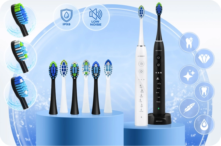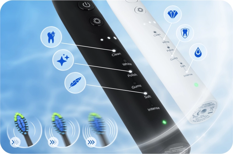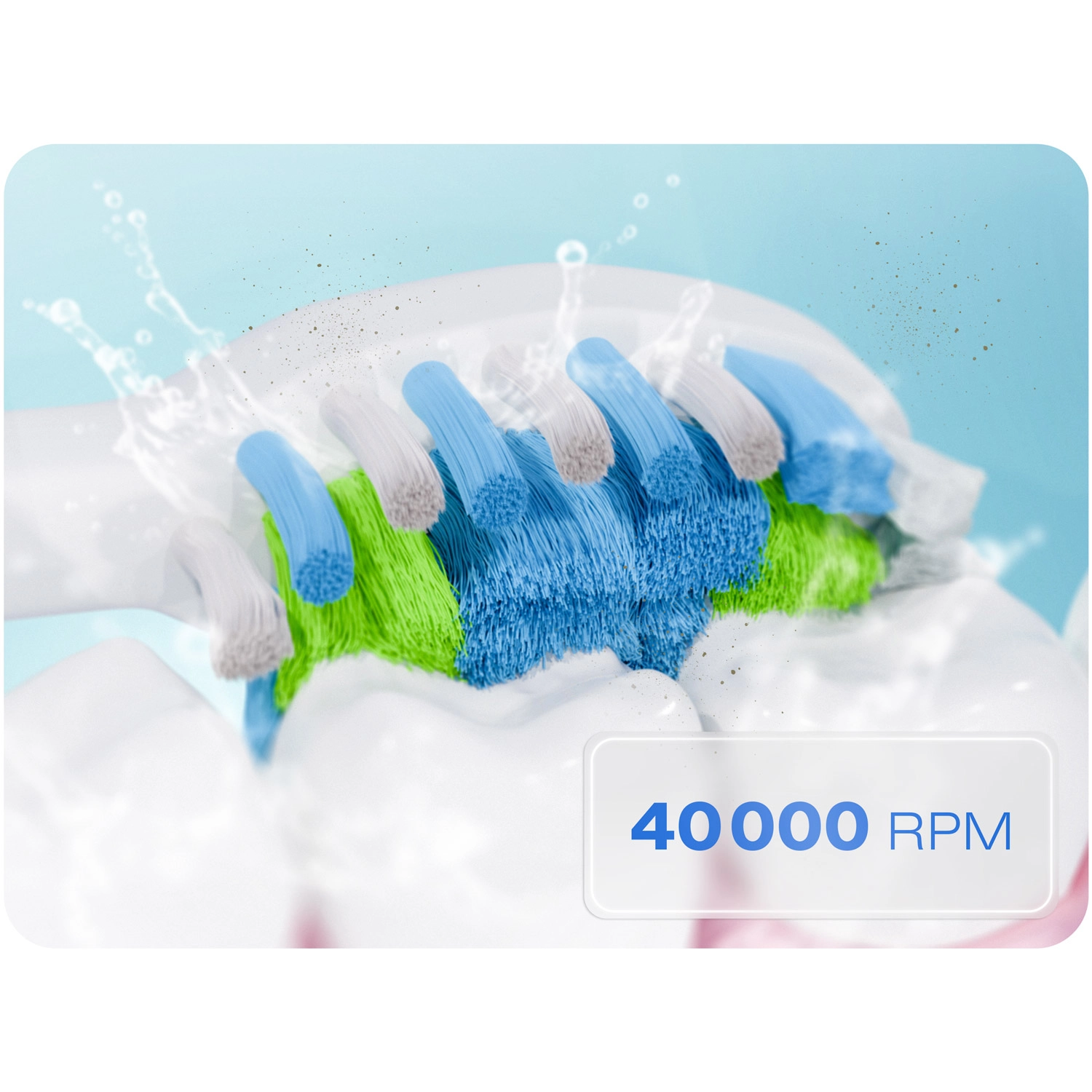 Získejte až 18 kombinací čištění díky 6 režimům (CLEAN, WHITE, POLISH, GUMS, SOFT, INTENSE) a 3 stupňům intenzity. Výkonný motor poskytuje 40 000 vibrací/min a baterie o kapacitě 800 mAh zajistí až 50 dní provozu na jedno nabití. Nechybí 2minutový časovač s 30sekundovým intervalem pro změnu kvadrantu a odolnost IPX8 pro bezpečné použití v koupelně.