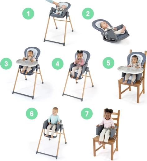 Objevte všestrannou dětskou jídelní židli, která roste s vaším dítětem od narození do 5 let. Model 7v1 nabízí 7 režimů použití od novorozeneckého lehátka po podsedák, ergonomické sezení 90/90/90 pro správné držení těla, nastavitelnou opěrku nohou, 5bodový/3bodový pás a snadnou údržbu díky pratelným potahům a pultíku vhodnému do myčky.