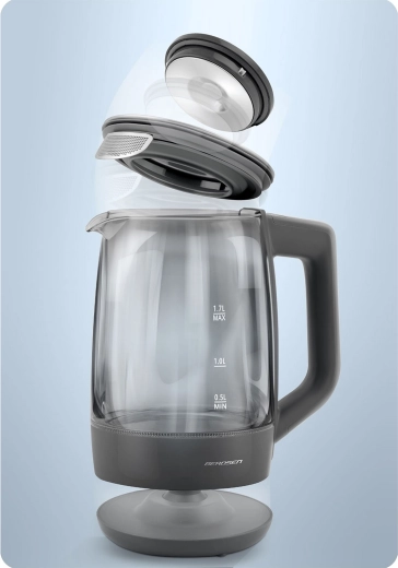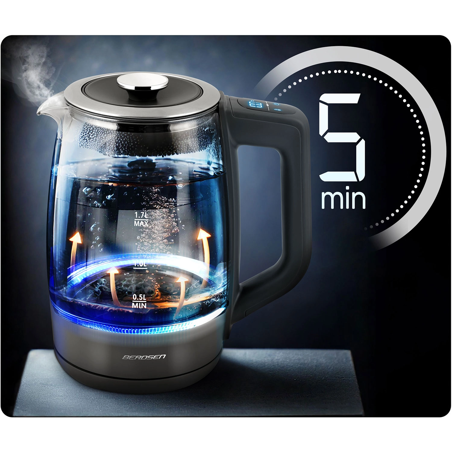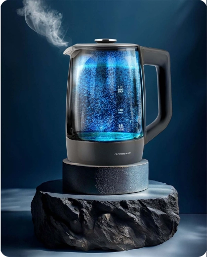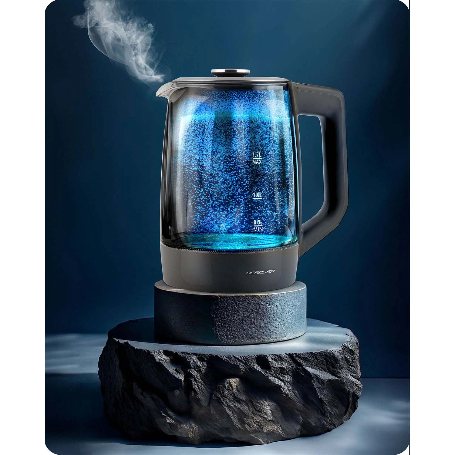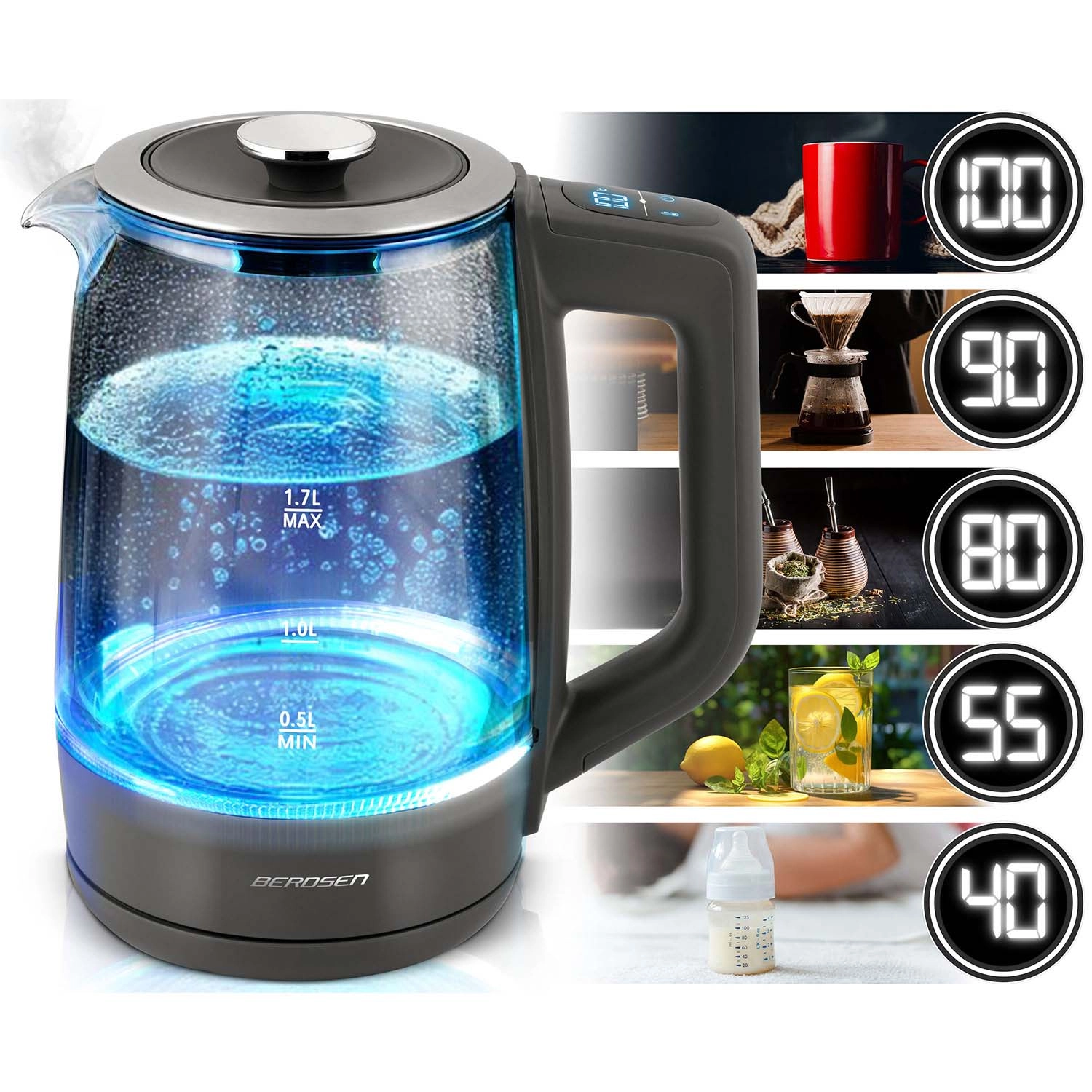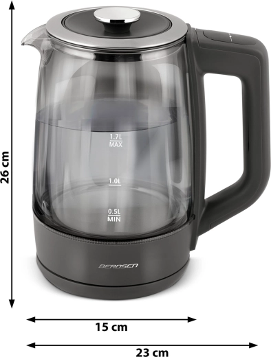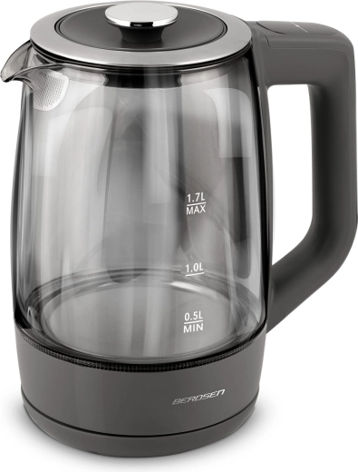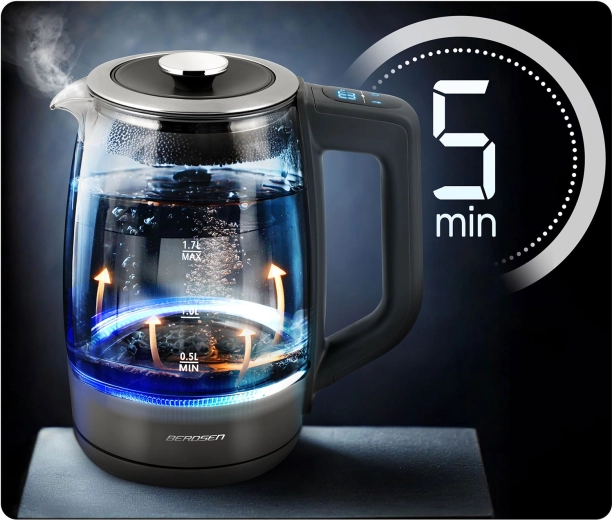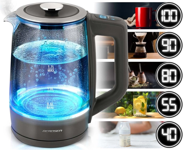 Objevte elegantní skleněnou rychlovarnou konvici BERDSEN 1,7 l se smart měřením teploty, dotykovým ovládáním a pětistupňovým nastavením teplot 40/55/80/90/100 °C. Odolné borosilikátové sklo, modré LED podsvícení při varu a funkce Keep Warm až 2 hodiny z ní dělají ideální volbu pro čaj, kávu i nápoje pro děti. Bezpečný provoz zajišťuje ochrana proti chodu nasucho a spolehlivá elektronika Powered by Strix.