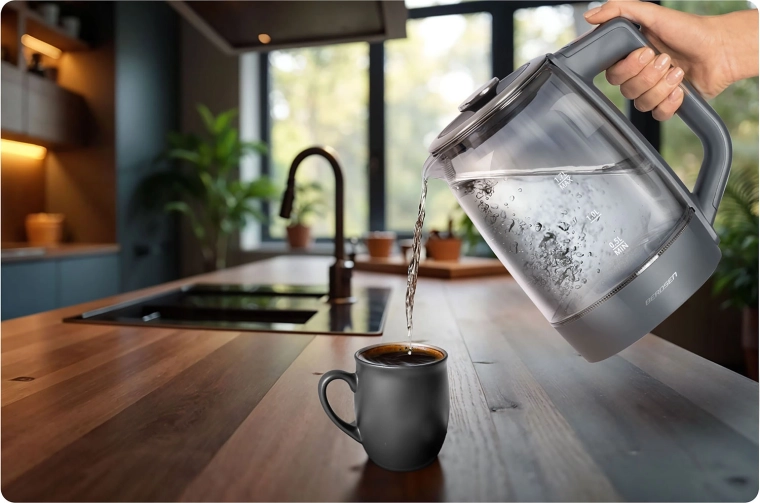 Odolné borosilikátové sklo je hygienické a snadno se čistí. Modré LED podsvícení zvýrazní proces varu a dodá vaší kuchyni moderní styl.