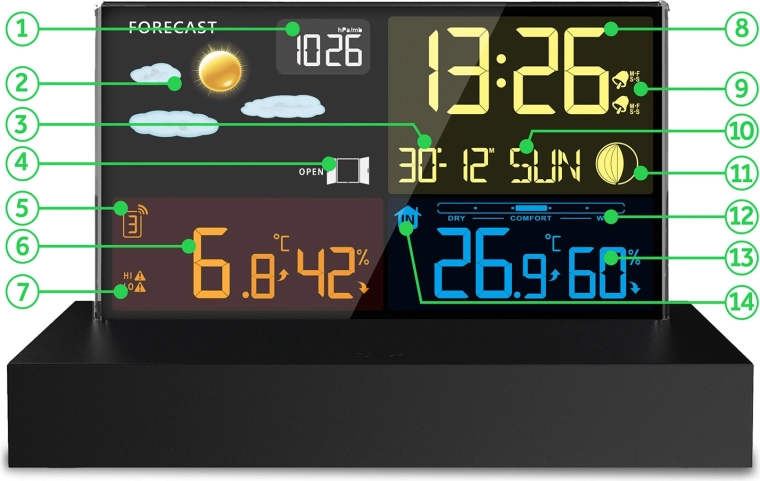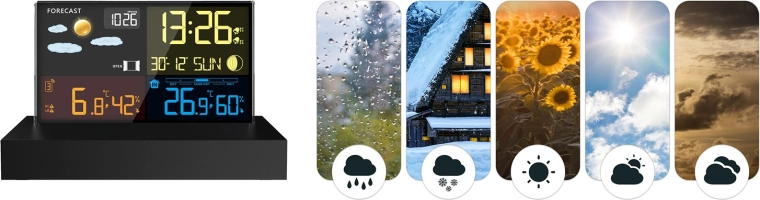 Velký barevný displej zobrazuje čas, datum, teplotu, vlhkost, ikony počasí a trendy. Stanice analyzuje tlak, teplotu a vlhkost a poskytuje přesnou krátkodobou předpověď.