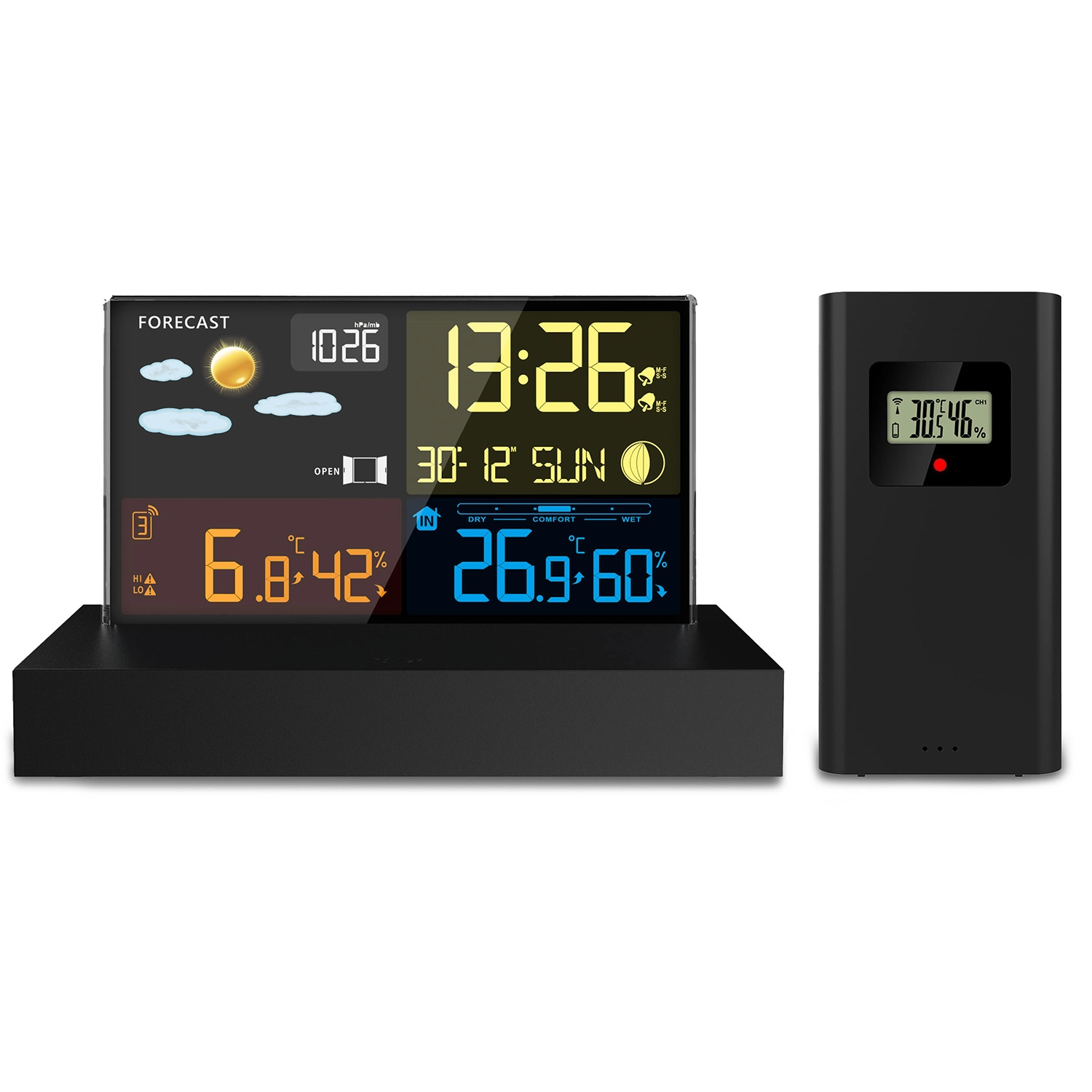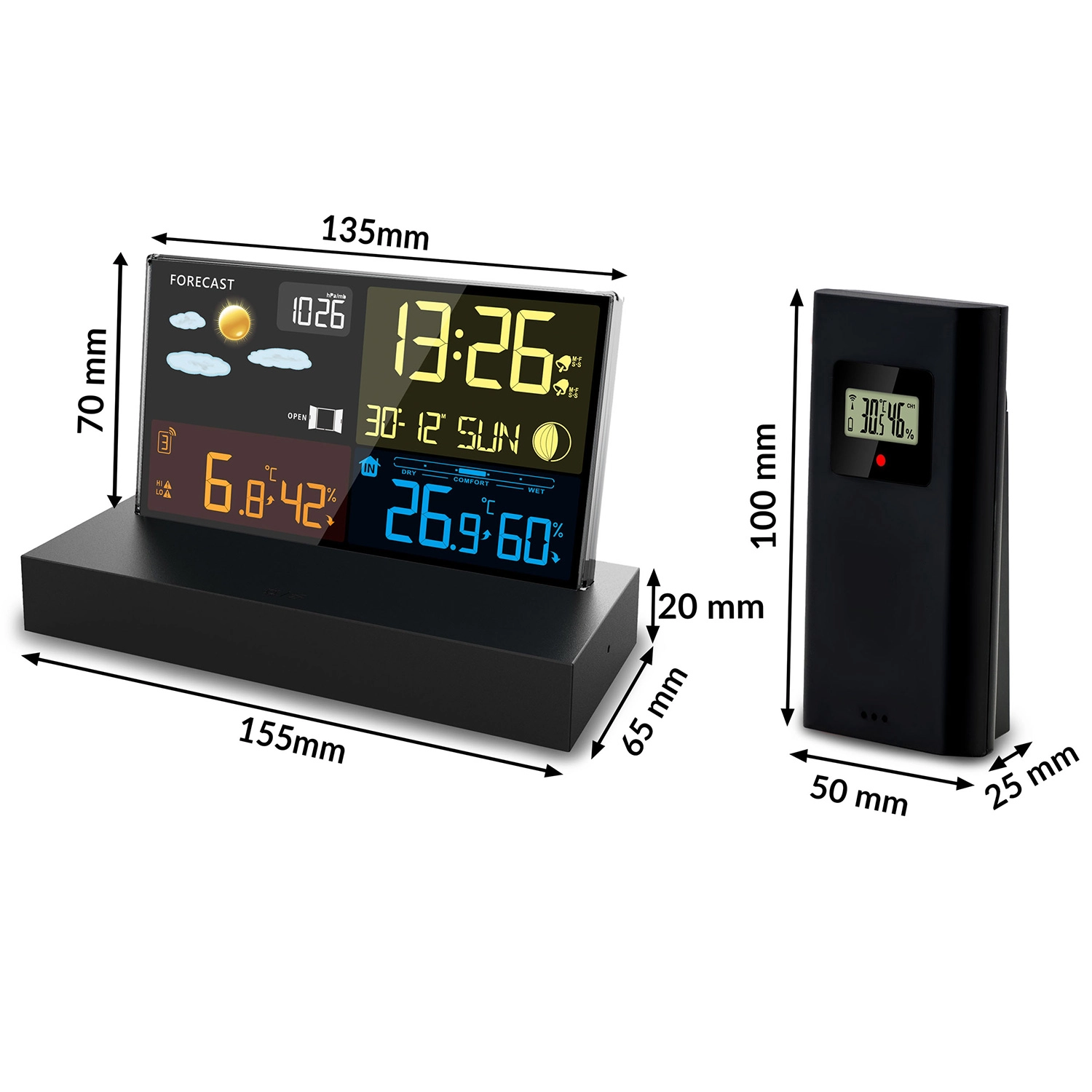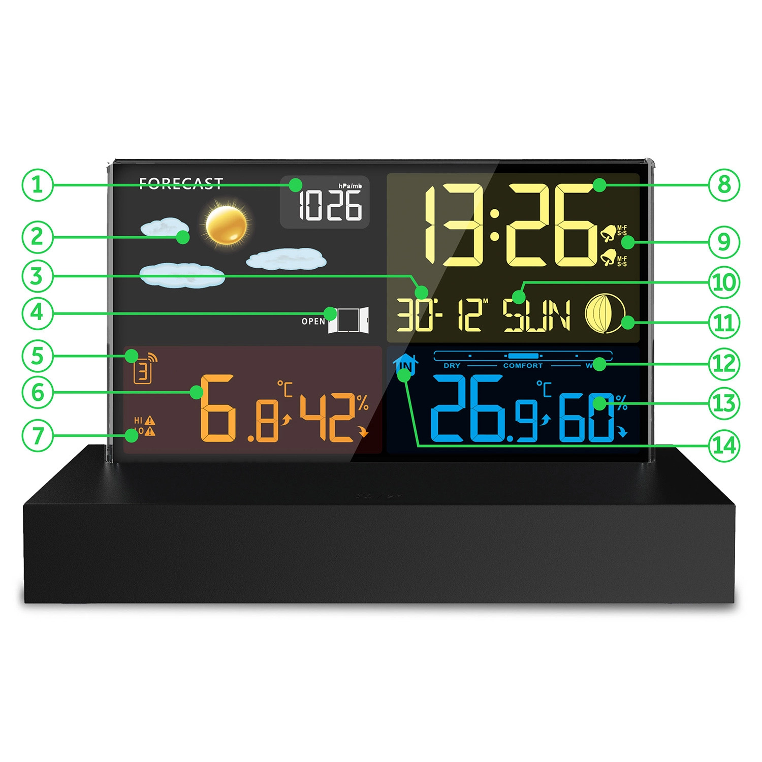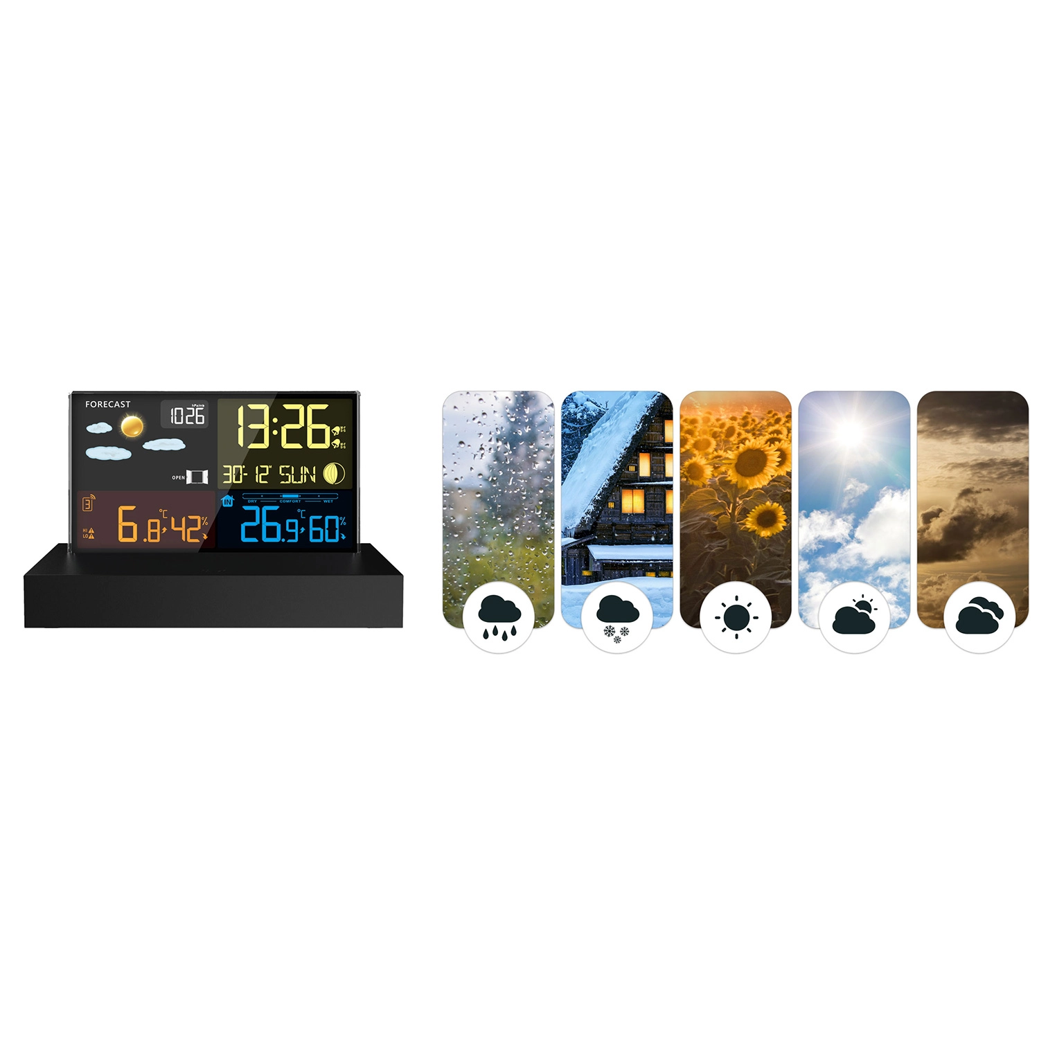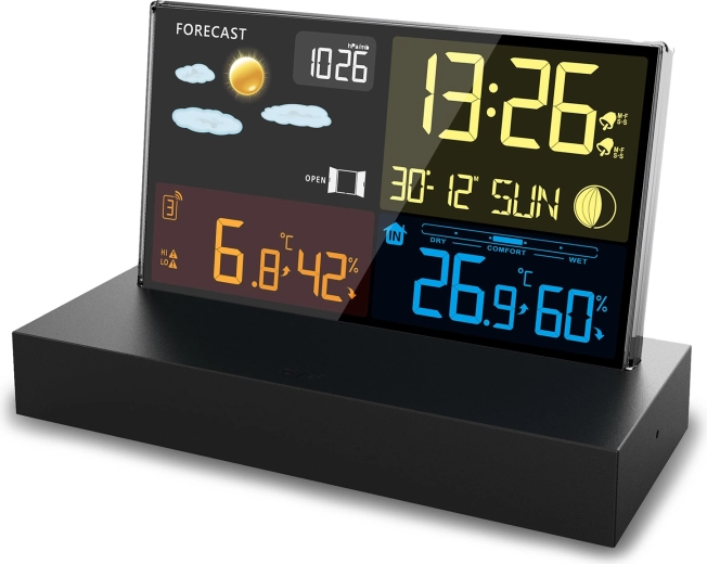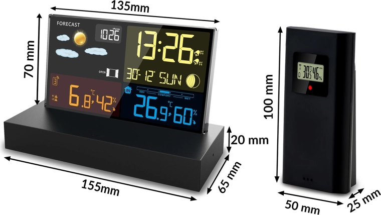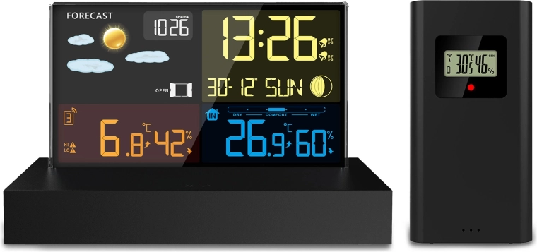 - Přehledný barevný LCD s ikonami počasí, fází Měsíce a stavem baterie
