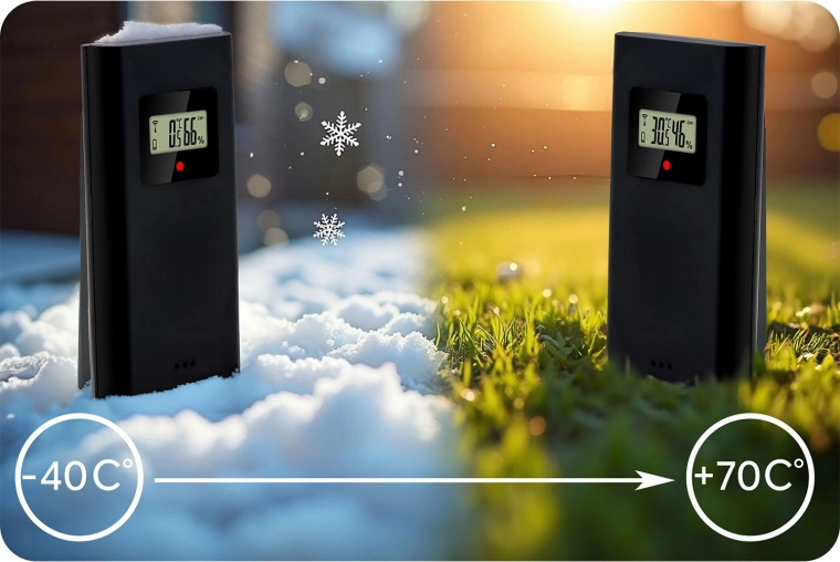 - Široké rozsahy měření: uvnitř -9,9 až 50 °C, venku -40 až 70 °C, vlhkost 20–95 % RH, tlak 850–1100 hPa