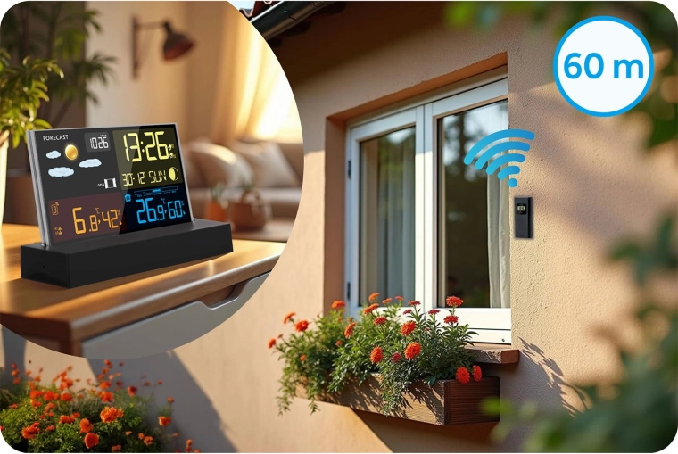 Díky bezdrátovému senzoru (až 60 m, 433,92 MHz) získáte aktuální venkovní hodnoty. Přístroj ukládá min./max. hodnoty, upozorní na mráz i horko a ukáže indikátor komfortu pro zdravé vnitřní klima. Podporuje až 3 kanály pro více zón v domácnosti.