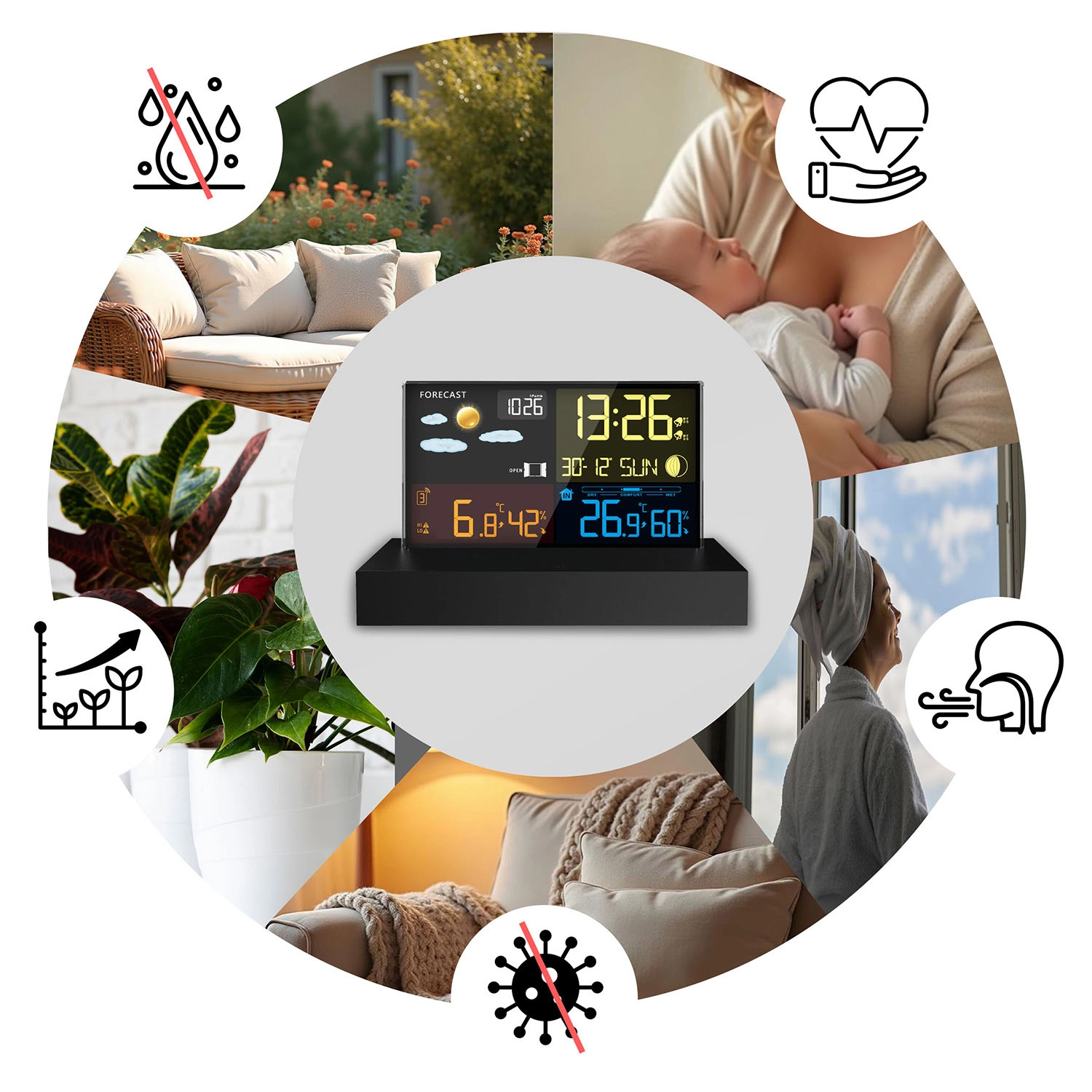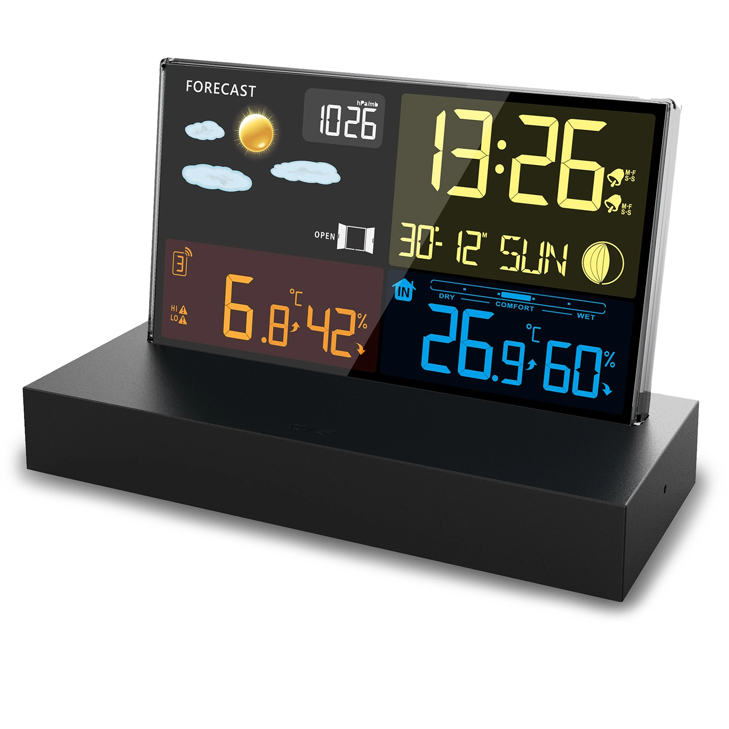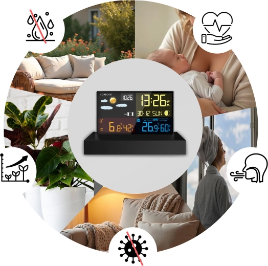 Rádiově řízený čas DCF, budík s funkcí odloženého buzení a indikátor komfortu pomáhají řídit denní režim i zdravé klima v místnosti.